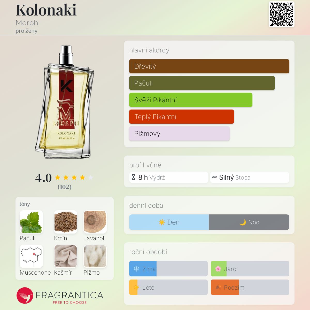 Kolonaki podle Morph je Citrus Gourmand vůně pro ženy. Vrchní tóny jsou Javanol, Muscenone a Kašmír; střední tóny jsouŘímský kmín, Pižmo a Agarové dřevo (oud) ; základní tóny jsou Pačuli, Vanilka a Jantar (ambra).