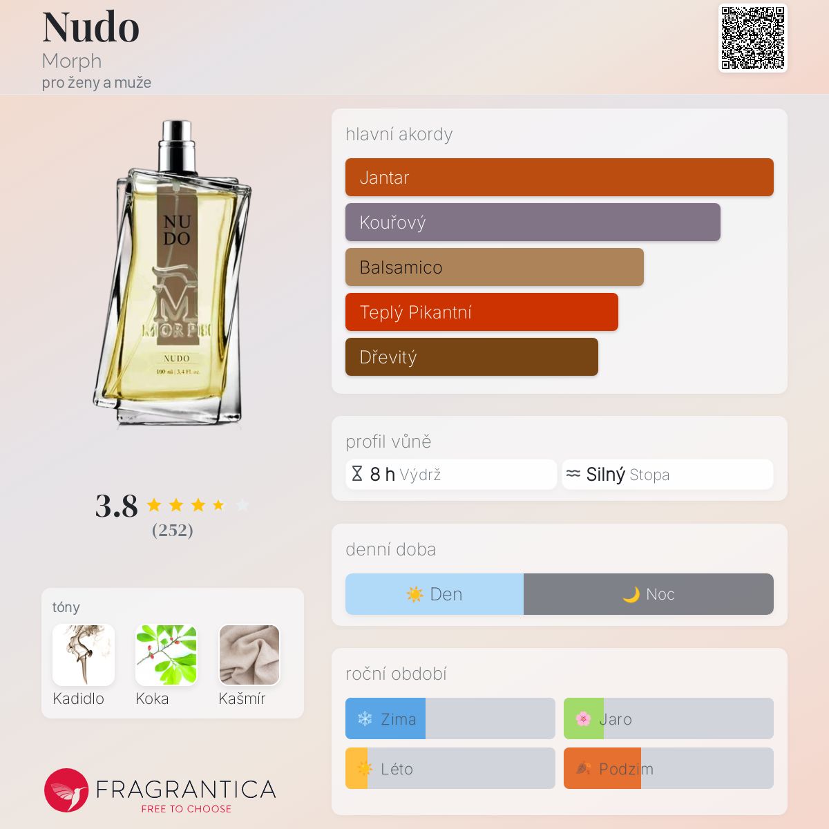Nudo podle Morph je Orientální vůně pro ženy a muže. Vrchní tón je Koka ; střední tón jeKadidlo ; základní tón je Kašmír.