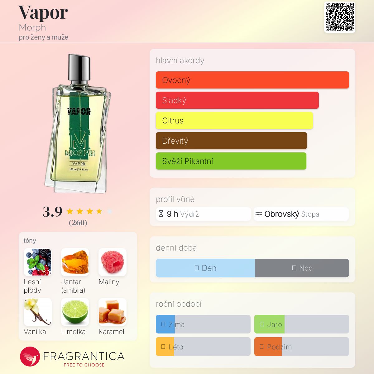 Vapor podle Morph je vůně pro ženy a muže. Vapor byl/a uveden/a v roce 2020. "Nosem" za touto vůní je Sofia Bardelli. Vrchní tóny jsou Limetka, Mandarinka a Černý pepř; střední tóny jsouLesní plody, Maliny, Pelargónie a Pivoňka ; základní tóny jsou Jantar (ambra), Madagaskarská vanilka, Karamel a Santalové dřevo.