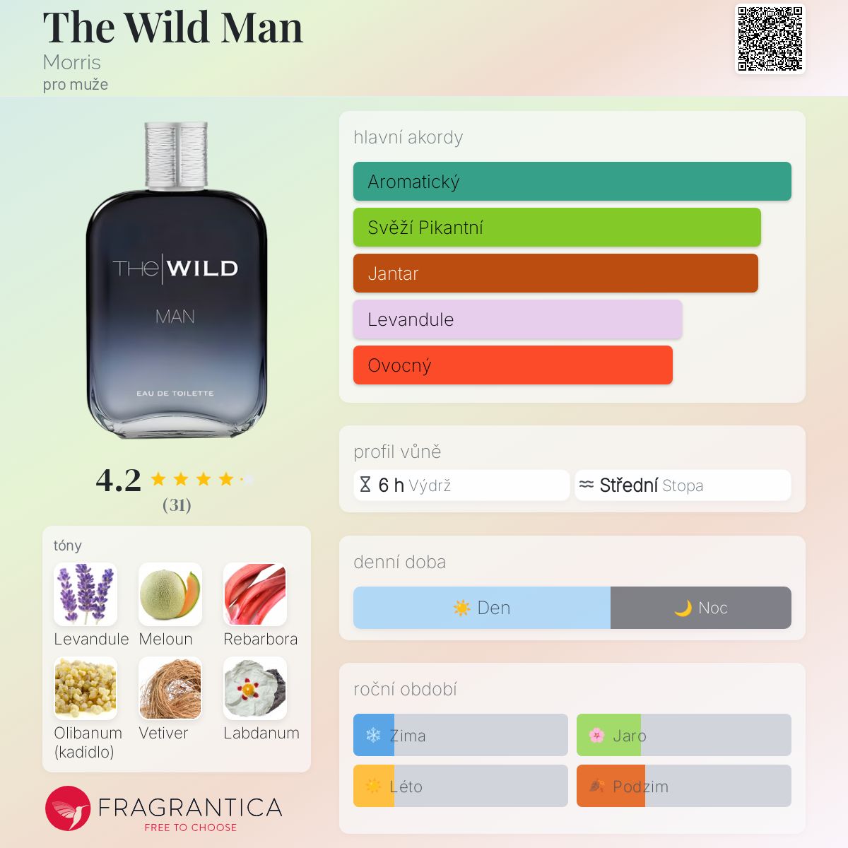 The Wild Man podle Morris je Orientální Fougere vůně pro muže. The Wild Man byl/a uveden/a v roce 2018. "Nosem" za touto vůní je Julie Pluchet. Vrchní tóny jsou Levandule, Meloun, Rebarbora, Ananas, Kalábrijský bergamot, Zelené tóny, Mandarinka a Grapefruit; střední tóny jsouLevandule, Pelargónie, Černý pepř, Jasmín a Magnólie ; základní tóny jsou Olibanum, Vetiver, Labdanum, Fazole tonka, Pačuli, Pižmo a Jantar (ambra).