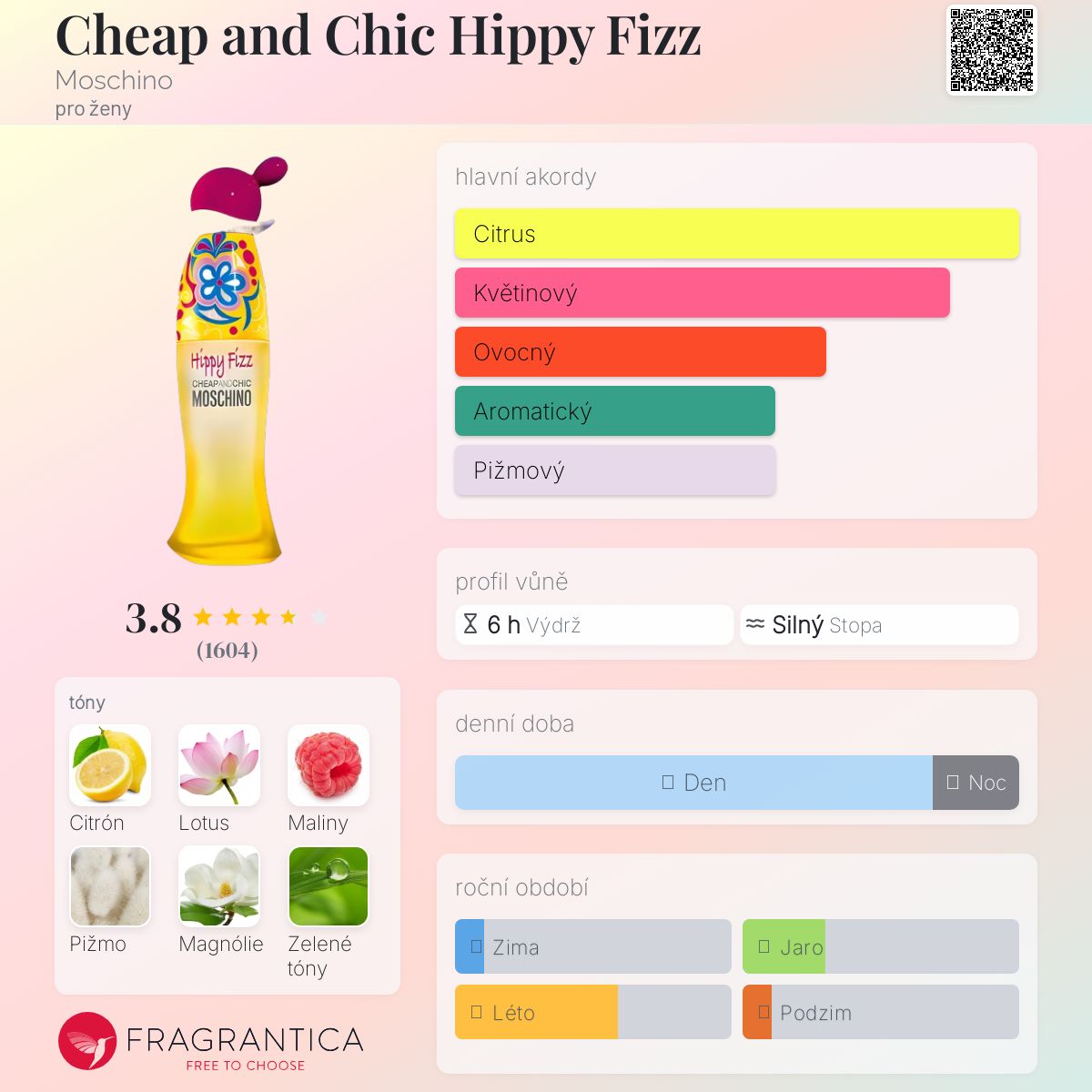 Cheap and Chic Hippy Fizz podle Moschino je Floral Fruity vůně pro ženy. Cheap and Chic Hippy Fizz byl/a uveden/a v roce 2008. "Nosem" za touto vůní je Vincente Marcello. Vrchní tóny jsou Citron amalfi , Maliny, Magnólie a Zelené listí; střední tóny jsouLotus, Růže a Fialka ; základní tóny jsou Pižmo, Vonokvětka, Virginský cedr a Dubový mech.