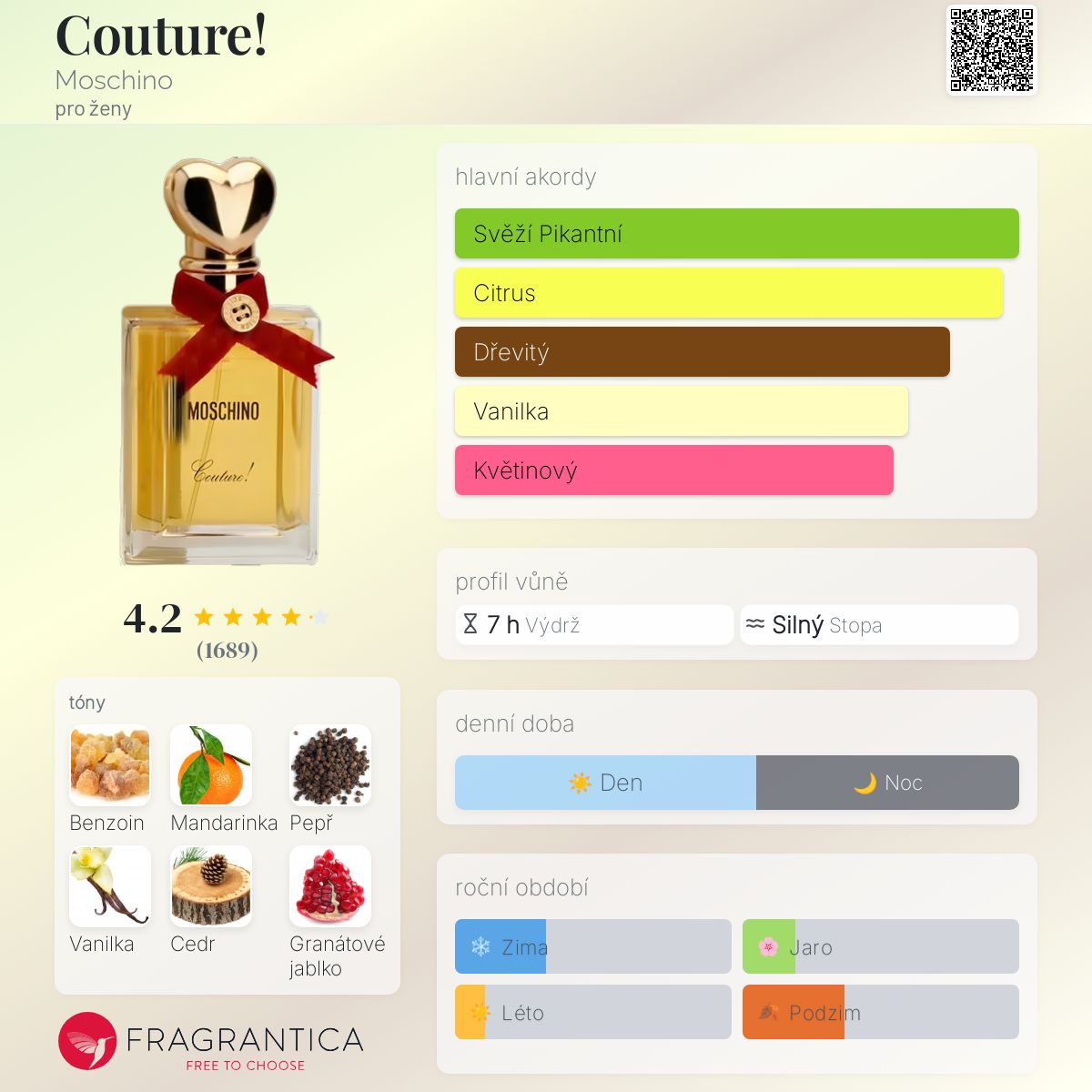 Couture! podle Moschino je Floral Woody Musk vůně pro ženy. Couture! byl/a uveden/a v roce 2004. "Nosem" za touto vůní je Olivier Cresp. Vrchní tóny jsou Mandarinka, Pepř a Bergamot; střední tóny jsouGranátové jablko, Pivoňka, Žlutý mák a Jasmín ; základní tóny jsou Benzoin, Vanilka a Cedr.