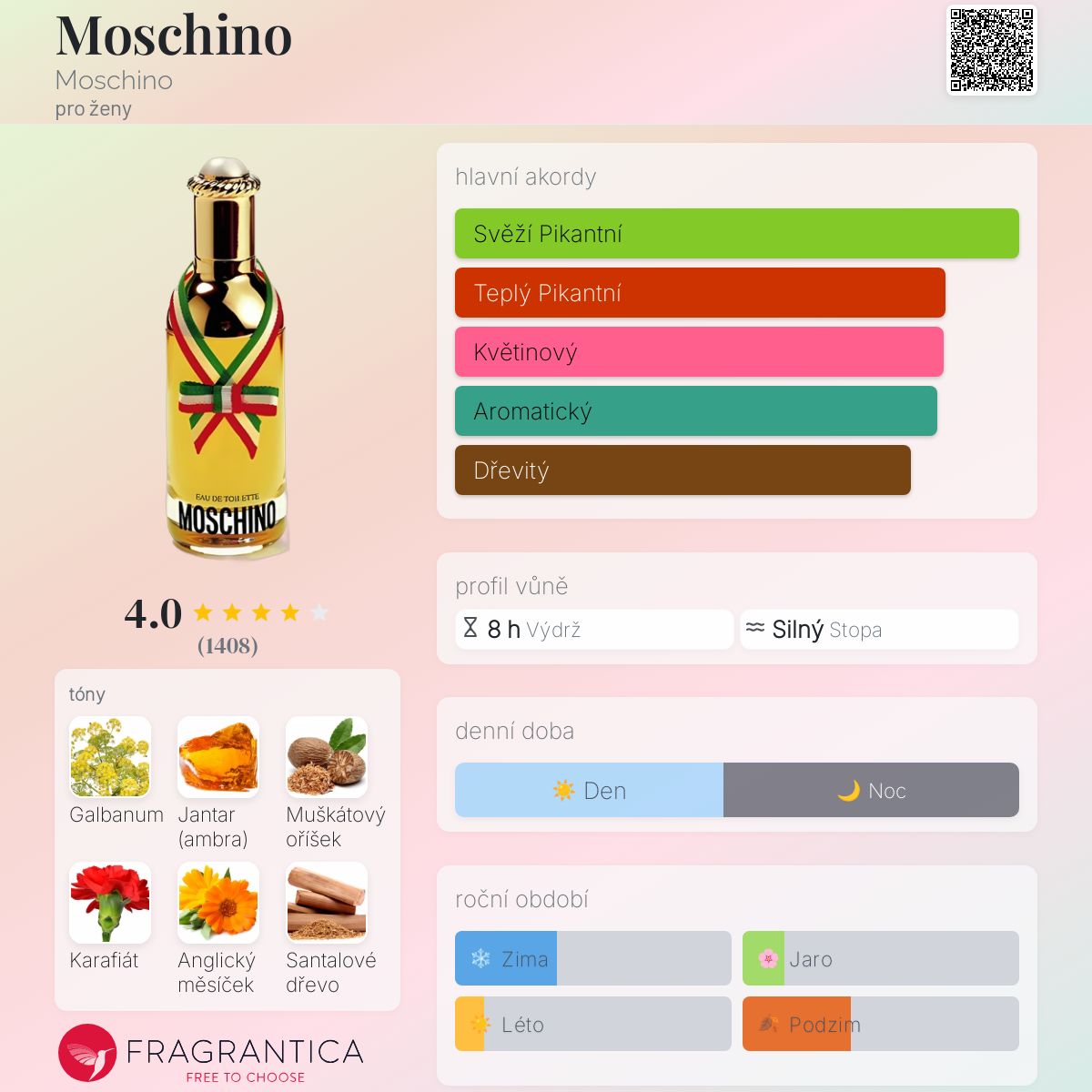 Moschino podle Moschino je Orientální vůně pro ženy. Moschino byl/a uveden/a v roce 1987. Vrchní tóny jsou Galbanum, Měsíček, Švestka, Zimolez a Frézie; střední tóny jsouMuškátový oříšek, Karafiát, Pepř, Ylang-Ylang, Gardénie a Růže ; základní tóny jsou Jantar (ambra), Santalové dřevo, Pačuli, Vanilka a Pižmo.