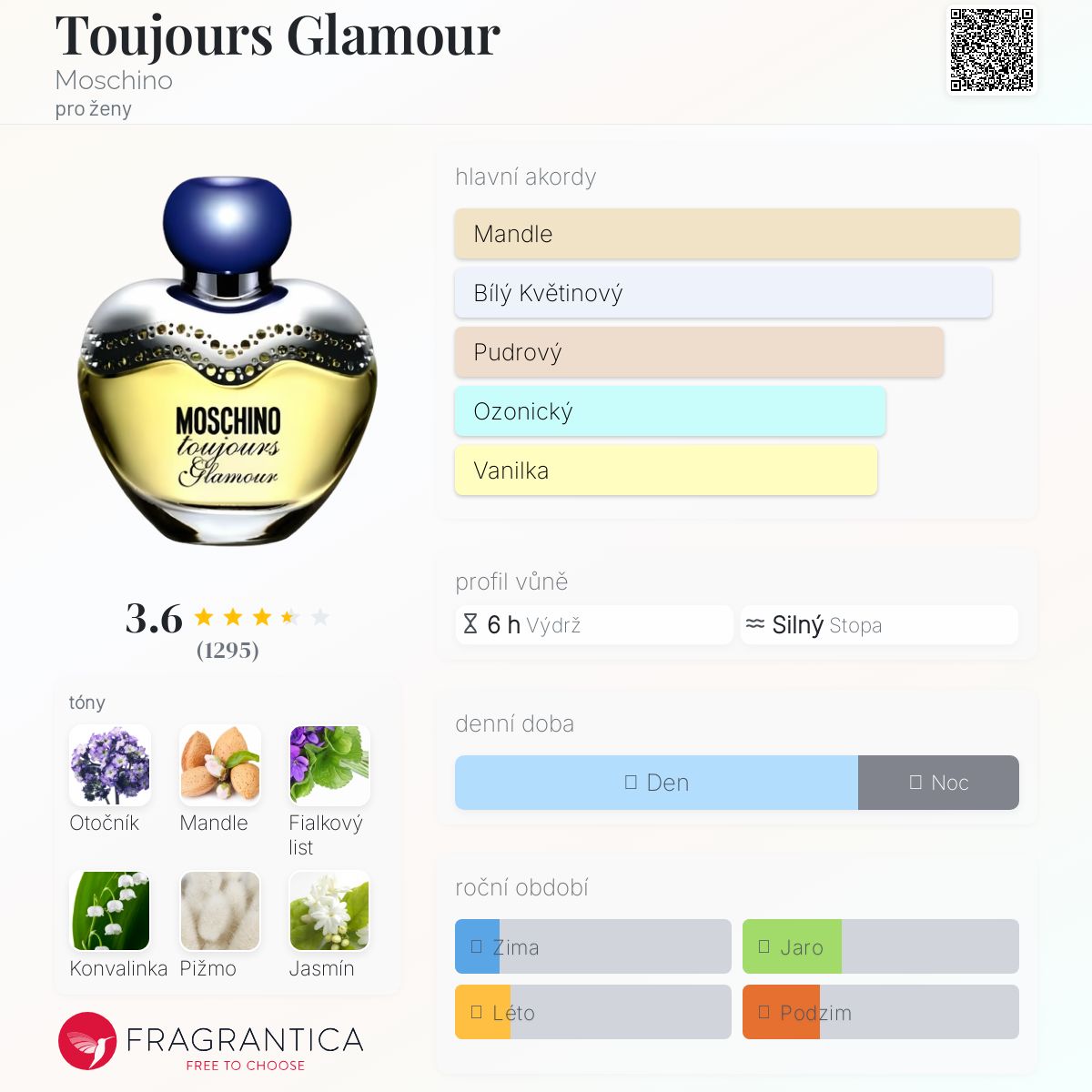 Toujours Glamour podle Moschino je Orientální Floral vůně pro ženy. Toujours Glamour byl/a uveden/a v roce 2010. Vrchní tóny jsou Fialkový list, Kardamom a Červený rybíz; střední tóny jsouMandle, Konvalinka a Jasmín ; základní tóny jsou Otočník, Pižmo a Benzoin.