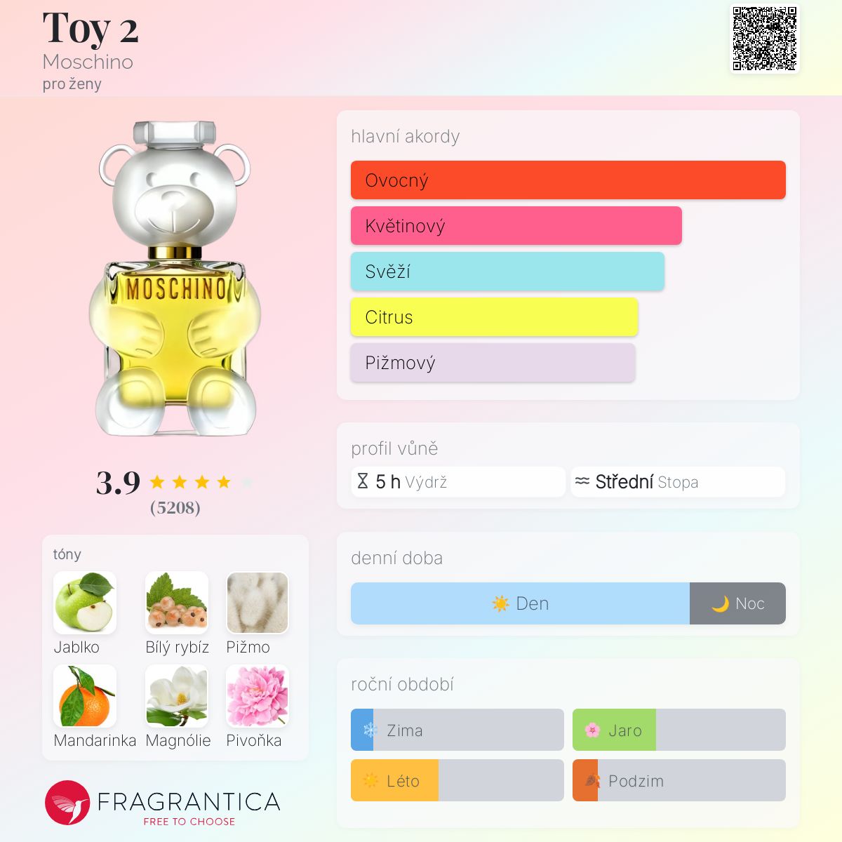 Je to velmi svěží, ovocná bílá květinová, pižmově jemná sladká vůně, která je po zaschnutí sladší, ale nijak výrazná; vnímám ji jako velmi mladistvou a energickou. Působí čistým dojmem, hodí se na denní nošení, sport i na běžné nošení, podle mého názoru vydrží dobrých 7 hodin se střední (4-5 hodin) až jemnou projekcí, jako většina vůní Moschino, které jsem používala. Dobrá volba na jaro-léto, doporučuji vyzkoušet, protože vnímání se mění, ale mohla bych ji doporučit jako vůni, která neobtěžuje.