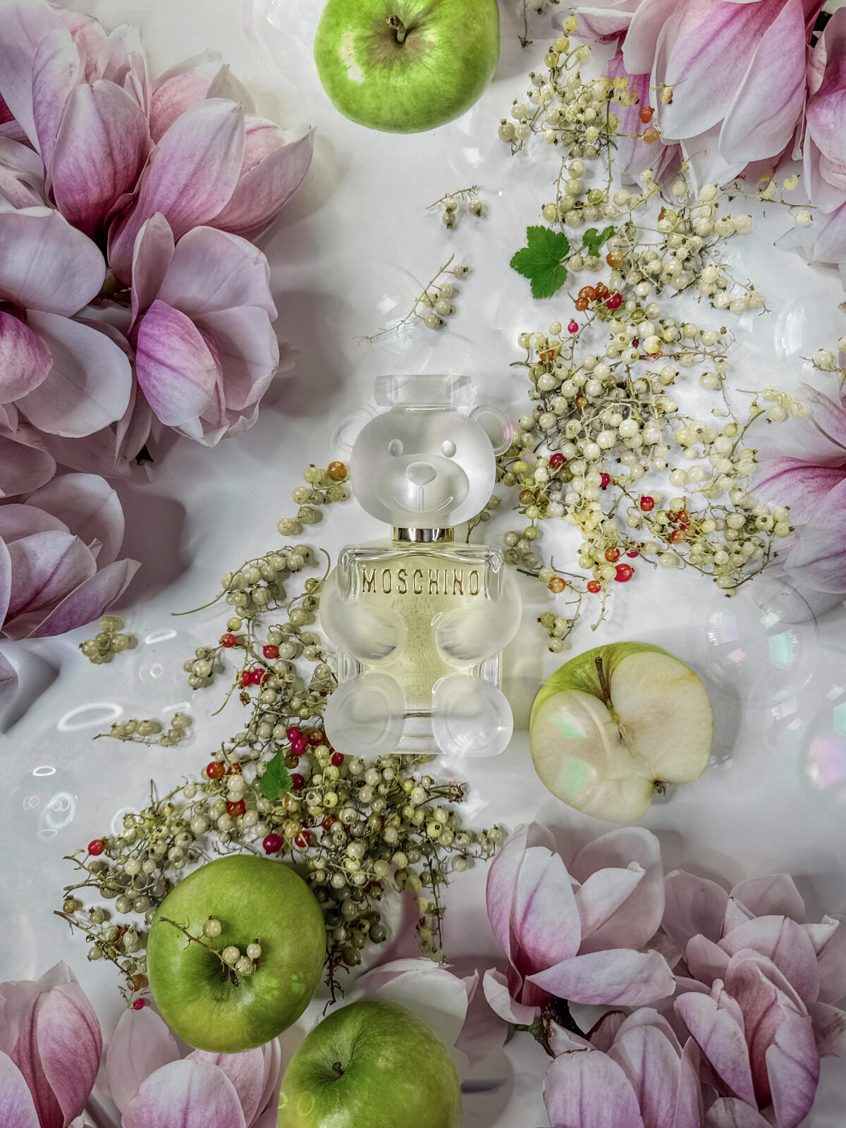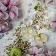 Nepovažujte ji však za talkový komfort nebo dětinskost. Má v sobě osobnost. Cítím v ní hodně magnólie, jablka a pivoňky, ale dřevité a s tou mýdlovou atmosférou, kterou vydává pižmo a santalové dřevo. Jablečné mýdlo, opravdu příjemné.