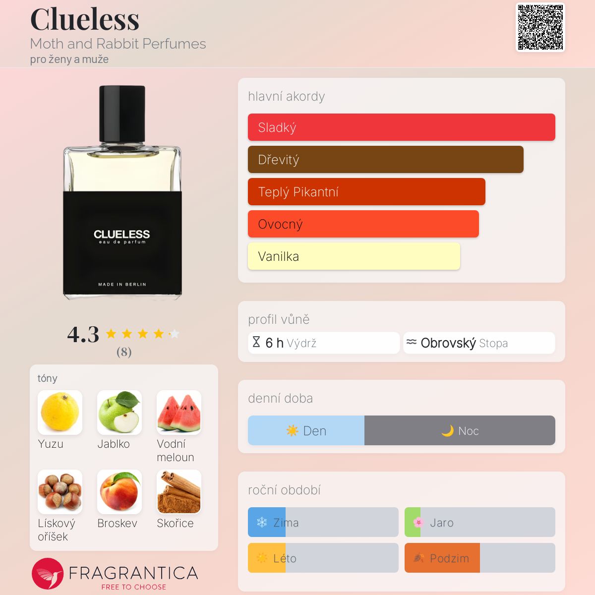Clueless podle Moth and Rabbit Perfumes je vůně pro ženy a muže. Clueless byl/a uveden/a v roce 2019. "Nosem" za touto vůní je Mark Buxton. Vrchní tóny jsou Yuzu, Zelené jablko, Vodní meloun, Lískový oříšek a Broskev; střední tóny jsouSkořice, Čokoláda, Cukr, Růže a Jasmín Sambac ; základní tóny jsou Pižmo, Vanilka, Cedr, Opoponax, Kůže a Pačuli.