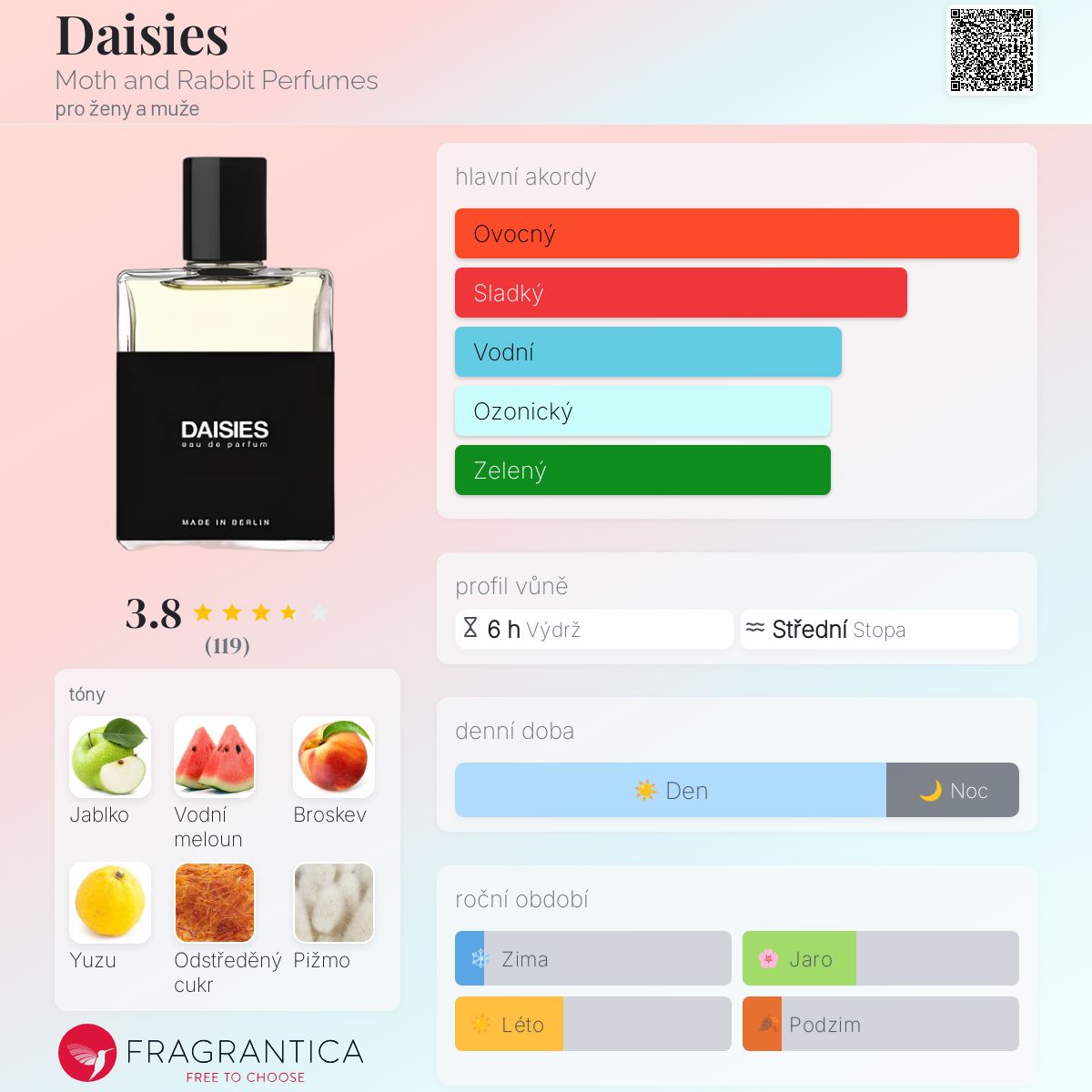 Daisies podle Moth and Rabbit Perfumes je Floral Fruity Gourmand vůně pro ženy a muže. "Nosem" za touto vůní je Mark Buxton. Vrchní tóny jsou Zelené jablko, Vodní meloun, Broskev, Yuzu a Lískový oříšek; střední tóny jsouCukrové nitě, Jasmín Sambac, Růže, Čokoláda a Skořice ; základní tóny jsou Pižmo, Vanilka, Cedr, Opoponax, Pačuli a Kůže.