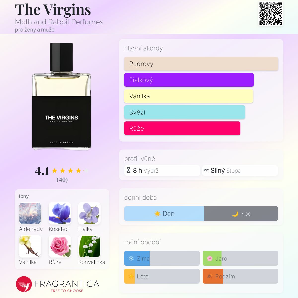 The Virgins podle Moth and Rabbit Perfumes je Orientální Woody vůně pro ženy a muže. "Nosem" za touto vůní je Mark Buxton. Vrchní tóny jsou Aldehydy, Fialka a Pelargónie; střední tóny jsouKosatec, Okvětní lístky růží, Konvalinka, Fazole tonka a Siamský (thajský) benzoin ;