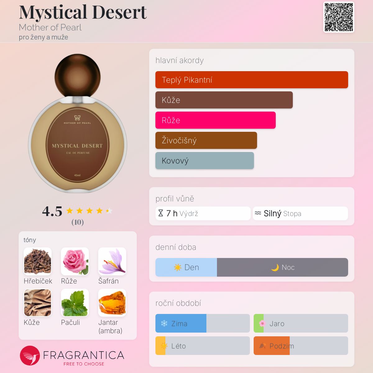 Mystical Desert podle Mother of Pearl je Orientální Spicy vůně pro ženy a muže. Mystical Desert byl/a uveden/a v roce 2023. "Nosem" za touto vůní je Jordi Fernández. Vrchní tóny jsou Hřebíček, Růže a Šafrán; střední tóny jsouPačuli a Jantar (ambra) ; základní tóny jsou Kůže a Jantar (ambra).