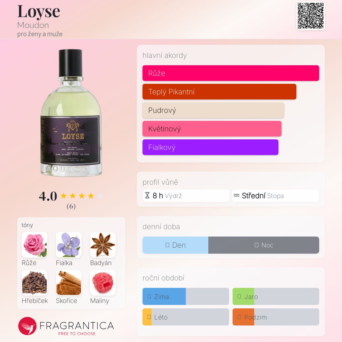 Loyse podle Moudon je vůně pro ženy a muže. Toto je nová vůně. Loyse byl/a uveden/a v roce 2024. Vrchní tóny jsou Růže, Badyán a Skořice; střední tóny jsouFialka, Hřebíček, Maliny a Růžový pepř ; základní tóny jsou Pačuli, Jantar (ambra) a Pižmo.