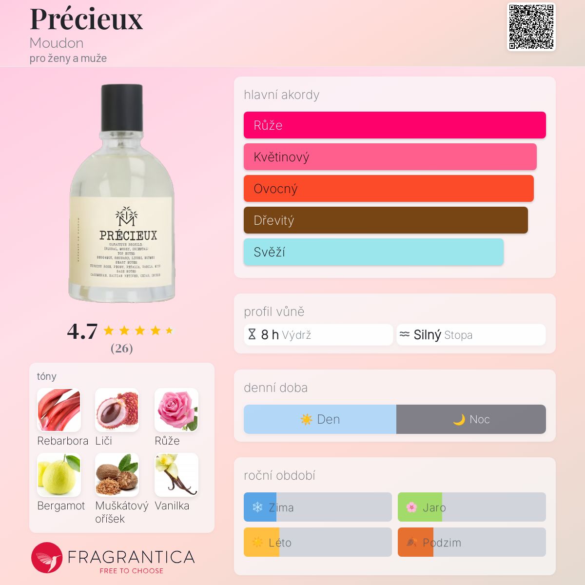 Précieux podle Moudon je Floral vůně pro ženy a muže. Précieux byl/a uveden/a v roce 2022. Vrchní tóny jsou Rebarbora, Liči, Bergamot a Muškátový oříšek; střední tóny jsouTurecká růže, Vanilka, Petalia, Pivoňka a Pižmo ; základní tóny jsou Haitský vetiver, Kašmír, Kadidlo a Cedr.