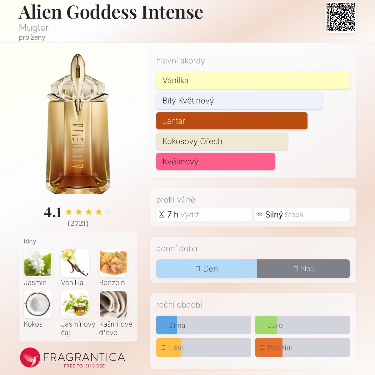 Velmi návyková vanilkovo-jasmínovo-kokosová vůně. Jsem velkým milovníkem jasmínu, ale ne toho indolického jako v Alien OG. V Goddess Intense je jasmín krémovější, já mám kokos, vanilku a benzoin. Perfektní pro celý rok, ale nejlepší v létě. Vyzkoušela jsem mnoho vůní s touto DNA, ale zatím jsou mými top výběry Guerlain Terracotta a Alien Goddess Intense. Opravdu krásná vůně a velmi bezpečná, nosím ji, když chci hezky vonět a nechci být cítit "niche".