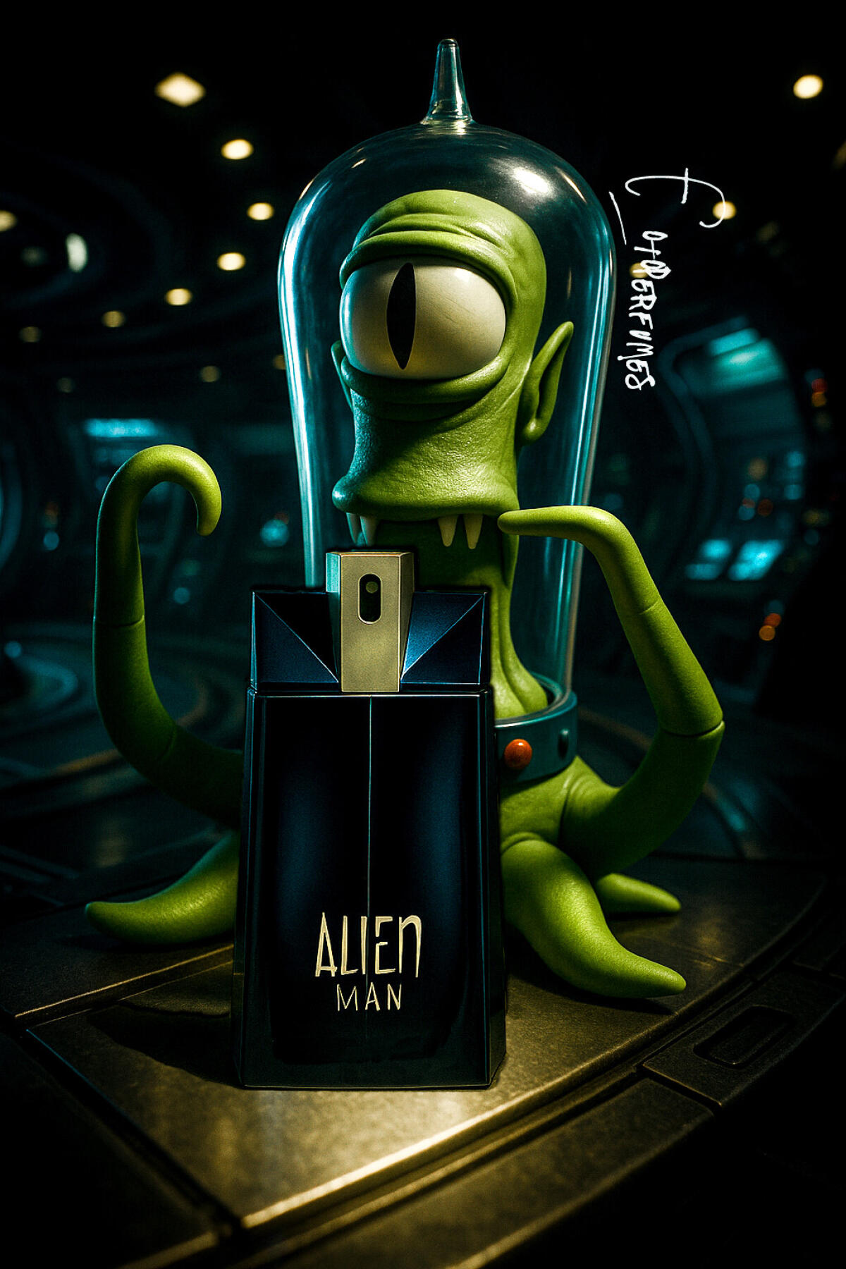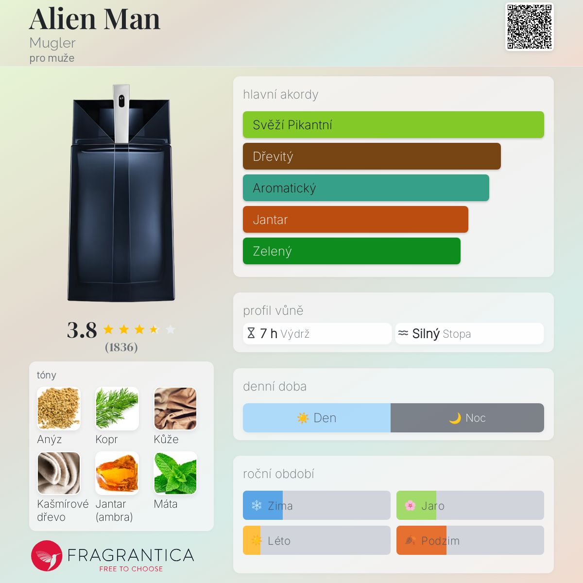 Alien Man podle Mugler je Orientální Woody vůně pro muže. Alien Man byl/a uveden/a v roce 2018. "Nosem" za touto vůní je Jean-Christophe Hérault. Vrchní tóny jsou Anýz, Kopr, Máta, Levandule, Buk, Tymián a Citrón; střední tóny jsouKůže, Kašmírové dřevo, Vonokvětka, Pepř a Pelargónie ; základní tóny jsou Bílý jantar (ambra), Kašmír a Vanilka.