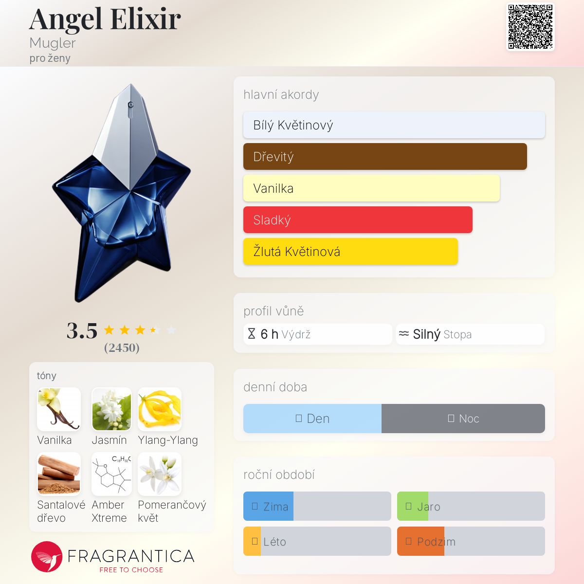 Jak dobrý je tento parfém. Nemá nic Angel ale..... má svou vlastní osobnost. Cítím tropickou květinovou vůni díky velmi elegantnímu a rafinovanému ylang ylang s teplým a zahalujícím základem, velmi smyslným. Ačkoli úvod je rozhodně květinový, v základu se uvolňuje opulentní a skvostný jantar, který dodává pokožce božskou vůni, která vydrží hodiny i na oblečení.