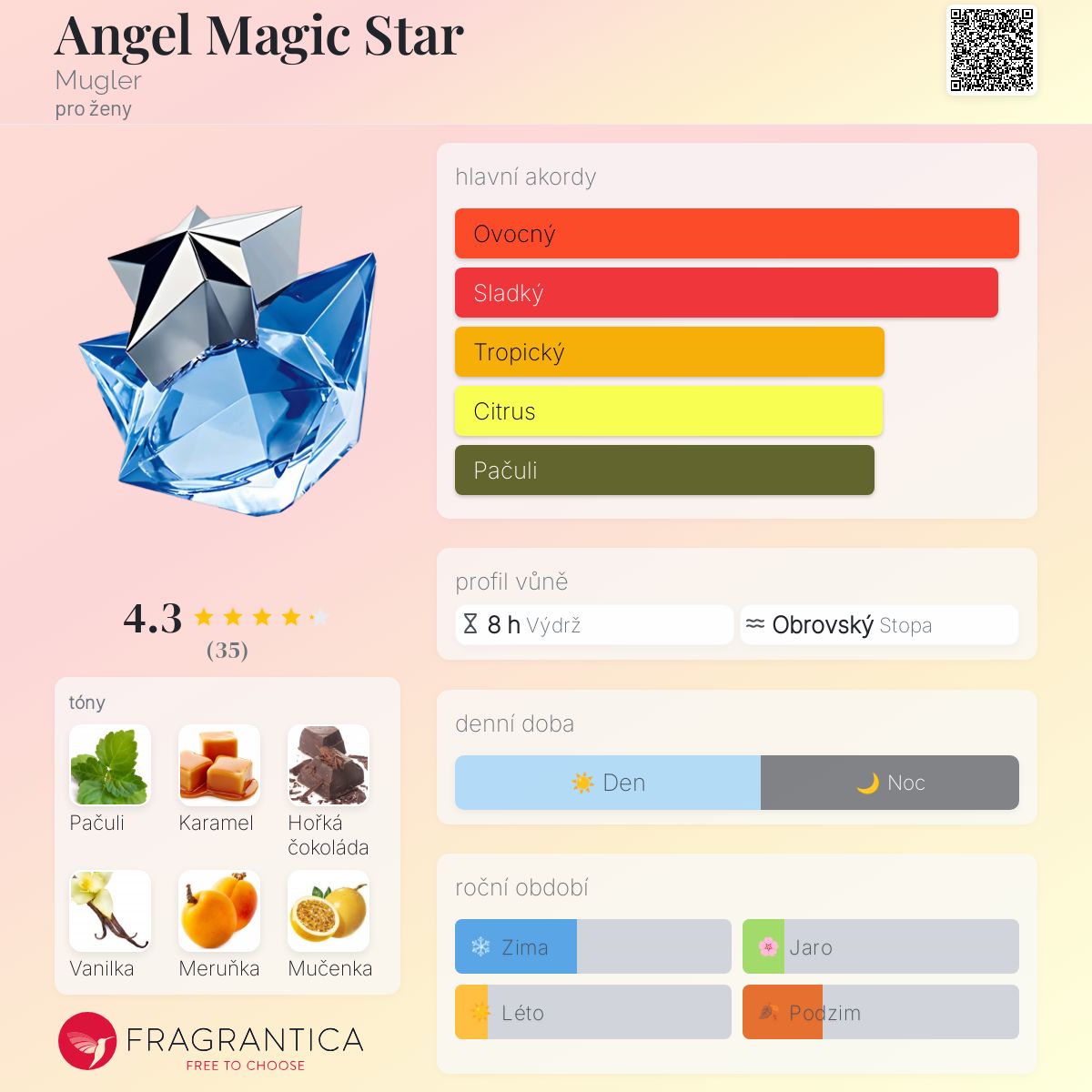 Angel Magic Star podle Mugler je Orientální Vanilla vůně pro ženy. Angel Magic Star byl/a uveden/a v roce 2013. Angel Magic Star byl/a vytvořen/a Olivier Cresp a Yves de Chiris. Vrchní tóny jsou Mandarinka, Tropické ovoce a Bergamot; střední tóny jsouMeruňka, Mučenka a Broskev ; základní tóny jsou Pačuli, Karamel, Čokoláda a Vanilka.