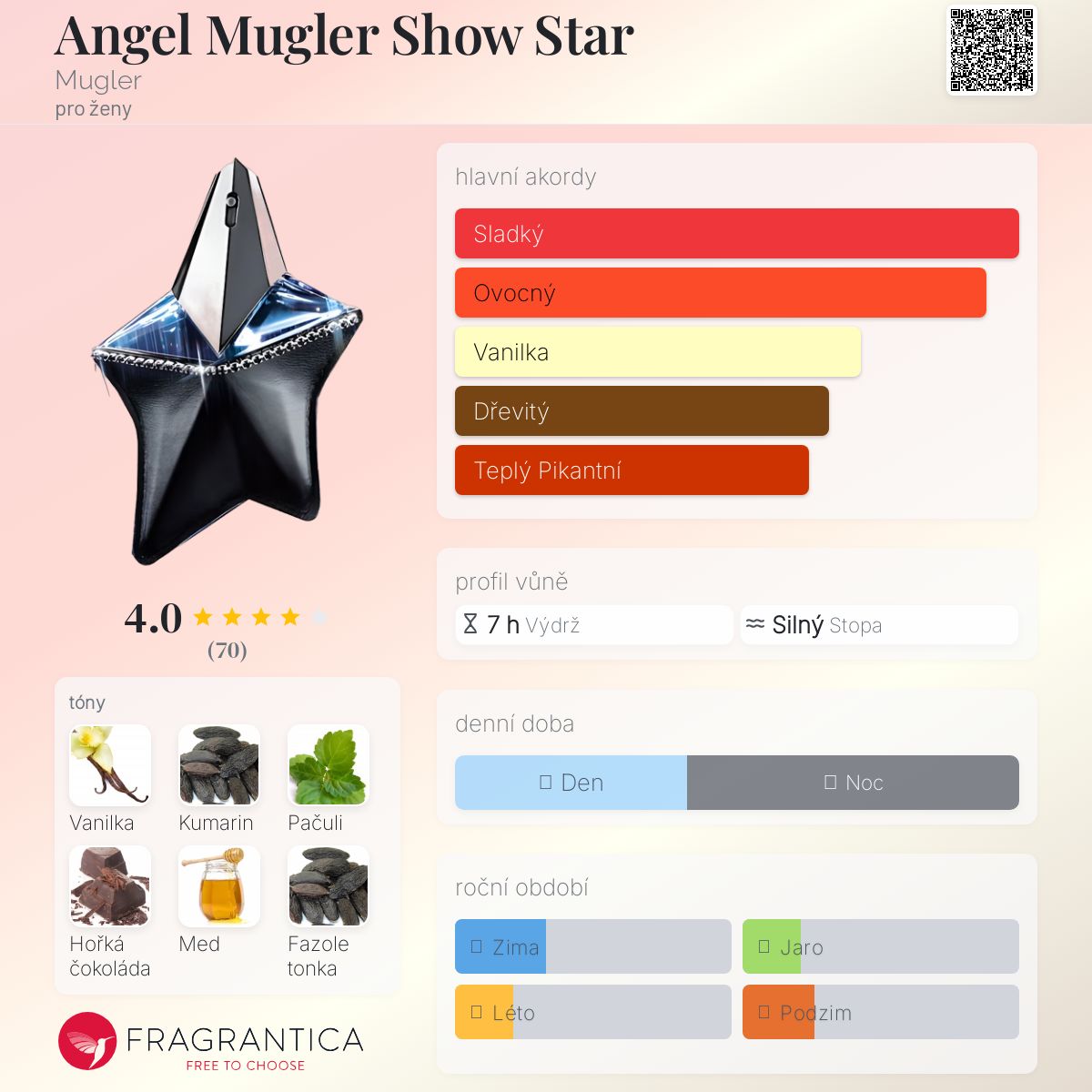 Angel Mugler Show Star podle Mugler je vůně pro ženy. Angel Mugler Show Star byl/a uveden/a v roce 2010. Angel Mugler Show Star byl/a vytvořen/a Olivier Cresp a Yves de Chiris. Vrchní tóny jsou Kokos, Ovocné tóny, Bergamot, Jasmín, Jahoda, Mandarinka, Meloun a Kasie; střední tóny jsouMed, Ostružina, Švestka, Červené bobule, Růže, Jasmín, Broskev, Konvalinka, Orchidej a Meruňka ; základní tóny jsou Vanilka, Kumarin, Pačuli, Hořká čokoláda, Fazole tonka, Karamel, Jantar (ambra), Santalové dřevo a Pižmo.