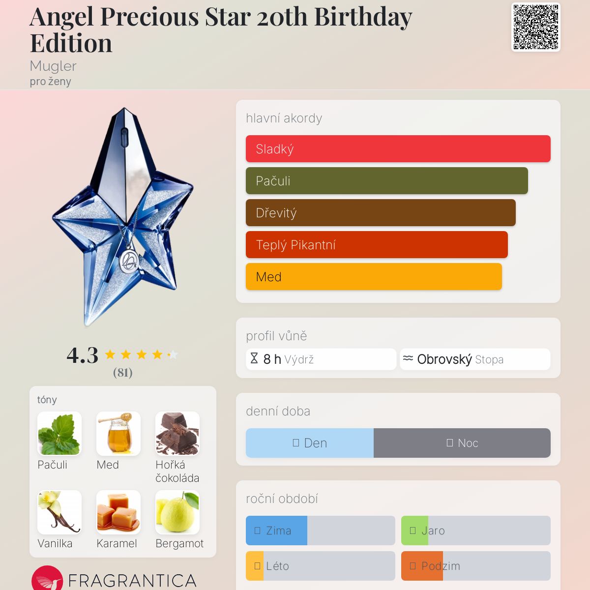 Angel Precious Star 20th Birthday Edition podle Mugler je Orientální Vanilla vůně pro ženy. Angel Precious Star 20th Birthday Edition byl/a uveden/a v roce 2012. Vrchní tóny jsou Bergamot a Lesní plody; střední tóny jsouMed a Vanilka ; základní tóny jsou Pačuli, Čokoláda a Karamel.