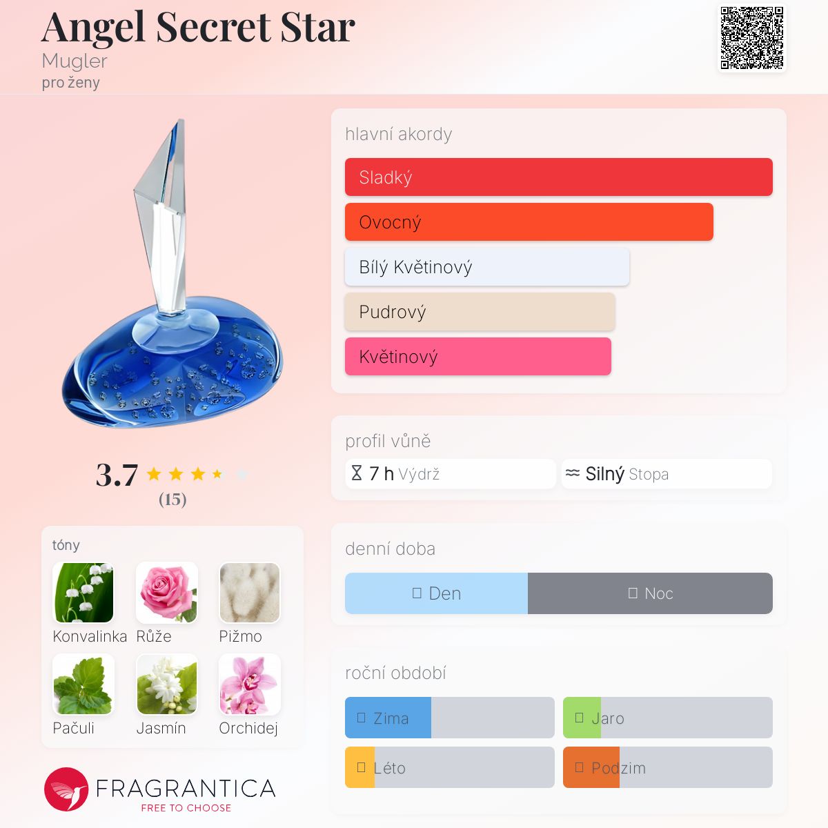 Angel Secret Star podle Mugler je Orientální Vanilla vůně pro ženy. Angel Secret Star byl/a uveden/a v roce 2014. Vrchní tóny jsou Jasmín, Cukrová vata, Bergamot, Kokos, Meloun, Mandarinka a Černý rybíz; střední tóny jsouKonvalinka, Růže, Orchidej, Jasmín, Med, Broskev, Ostružina, Švestka, Červené bobule a Meruňka ; základní tóny jsou Pižmo, Pačuli, Hořká čokoláda, Fazole tonka, Jantar (ambra), Vanilka a Karamel.