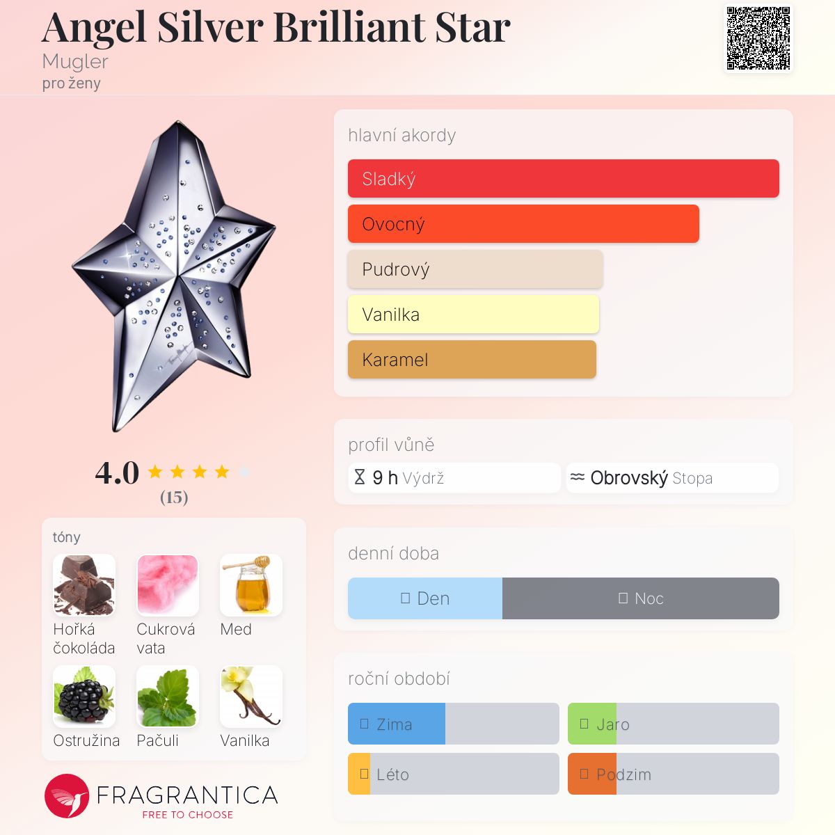 Angel Silver Brilliant Star podle Mugler je Orientální Vanilla vůně pro ženy. Angel Silver Brilliant Star byl/a uveden/a v roce 2013. Vrchní tóny jsou Cukrová vata, Kokos, Jasmín, Meloun, Červené bobule, Bergamot a Černý rybíz; střední tóny jsouMed, Ostružina, Meruňka, Švestka, Broskev, Orchidej, Jasmín, Růže, Konvalinka a Červené bobule ; základní tóny jsou Čokoláda, Pačuli, Vanilka, Karamel, Fazole tonka, Jantar (ambra) a Pižmo.