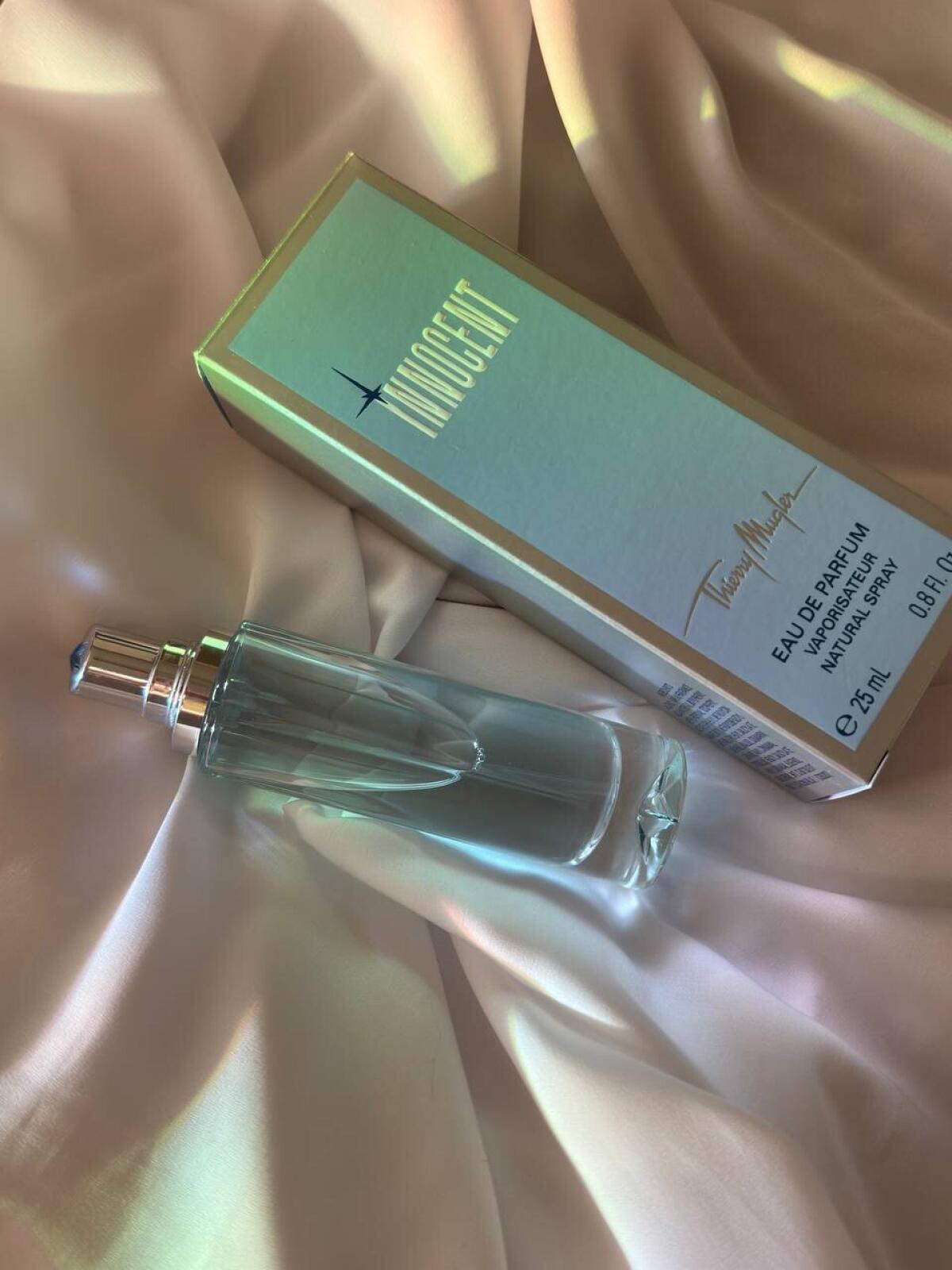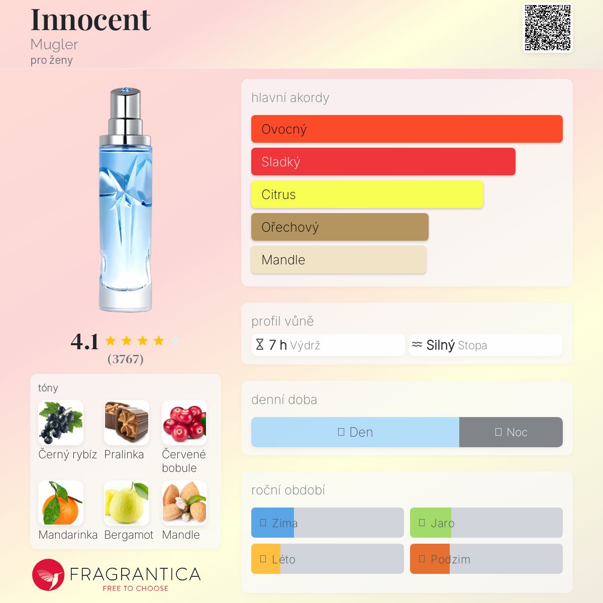 Innocent podle Mugler je Orientální Vanilla vůně pro ženy. Innocent byl/a uveden/a v roce 1998. "Nosem" za touto vůní je Laurent Bruyere. Vrchní tóny jsou Mandarinka a Bergamot; střední tóny jsouČerný rybíz, Červené bobule a Mandle ; základní tóny jsou Pralinka, Bílé pižmo a Jantar (ambra).