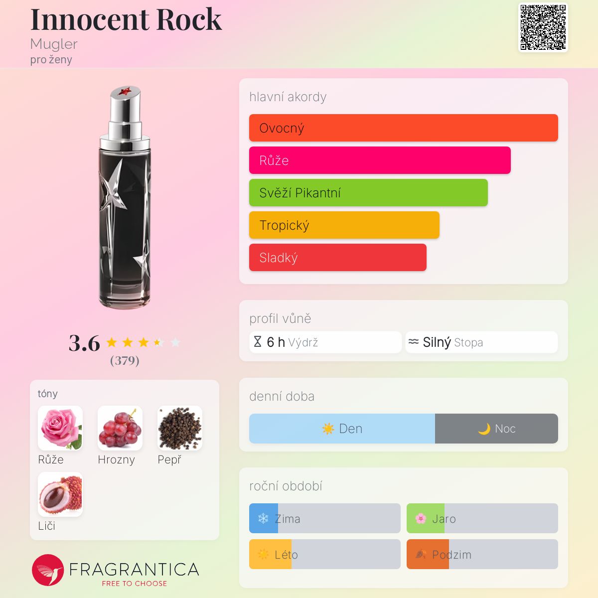 Innocent Rock podle Mugler je Floral Fruity vůně pro ženy. Innocent Rock byl/a uveden/a v roce 2008. "Nosem" za touto vůní je Nathalie Feisthauer. Vrchní tóny jsou Hrozny a Liči; střední tón jeRůže ; základní tón je Pepř.