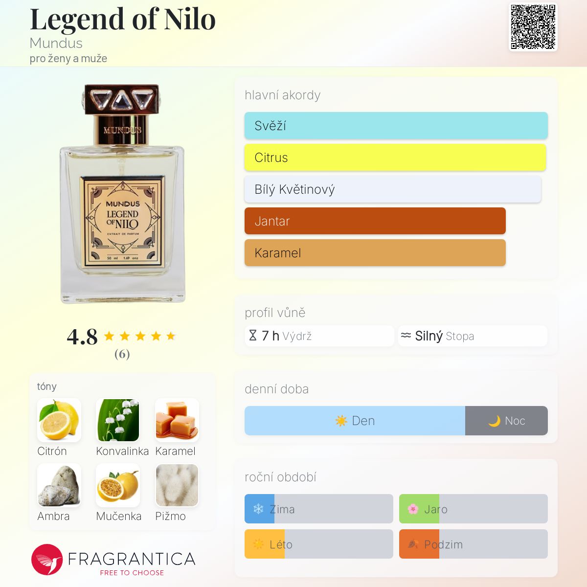 Legend of Nilo podle Mundus je vůně pro ženy a muže. Toto je nová vůně. Legend of Nilo byl/a uveden/a v roce 2025. Vrchní tóny jsou Citrón, Karamel a Mučenka; střední tóny jsouKonvalinka, Karamel a Mučenka ; základní tóny jsou Ambra, Pižmo a Vanilka.