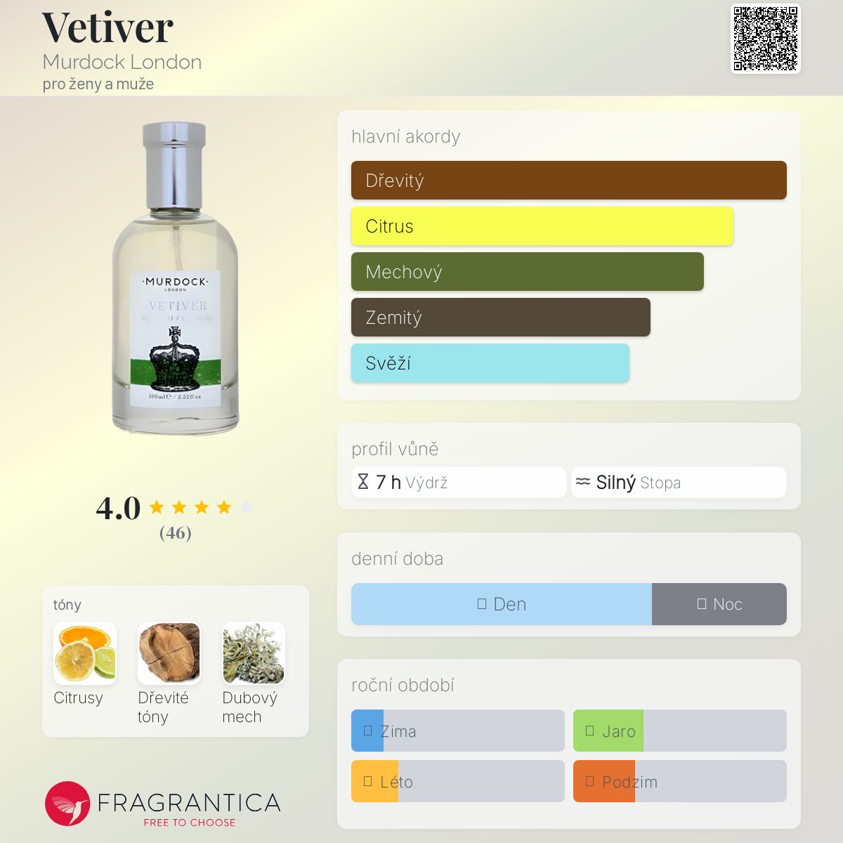 Vetiver podle Murdock London je Woody Aromatic vůně pro ženy a muže. Vetiver byl/a uveden/a v roce 2011. Vrchní tón je Citrusy ; základní tóny jsou Dřevité tóny a Dubový mech.