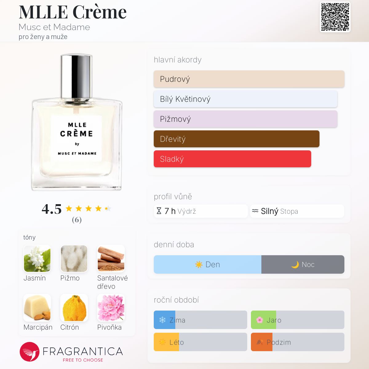 MLLE Crème podle Musc et Madame je Floral Fruity Gourmand vůně pro ženy a muže. MLLE Crème byl/a uveden/a v roce 2021. "Nosem" za touto vůní je Linda Sivrican.