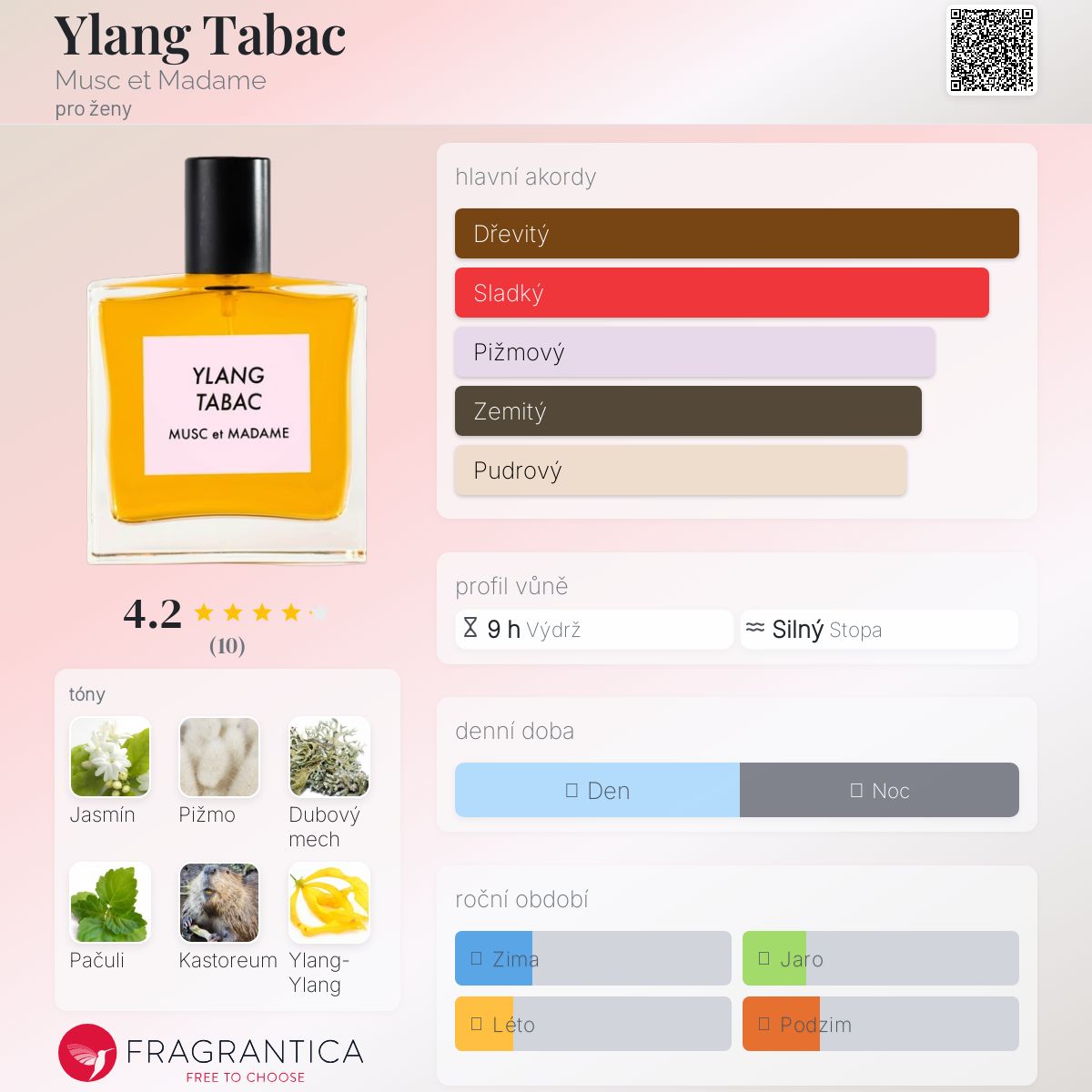 Ylang Tabac podle Musc et Madame je Floral vůně pro ženy. Ylang Tabac byl/a uveden/a v roce 2015. "Nosem" za touto vůní je Linda Sivrican.