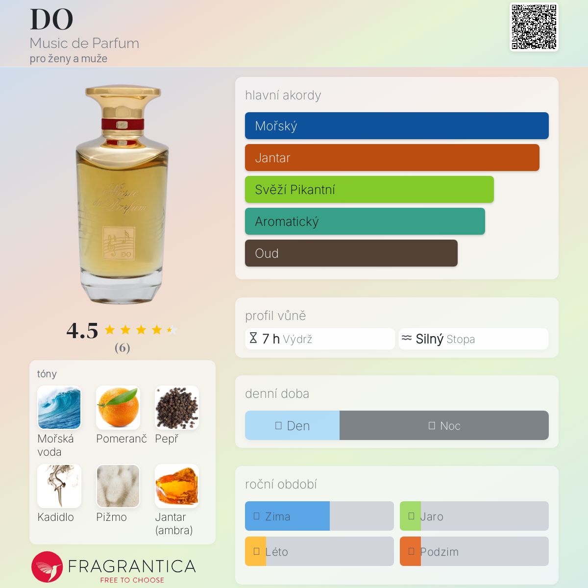 DO podle Music de Parfum je Citrus Aromatic vůně pro ženy a muže. DO byl/a uveden/a v roce 2016. "Nosem" za touto vůní je Christian Provenzano. Vrchní tóny jsou Mořské tóny a Pomeranč; střední tóny jsouČerný pepř a Kadidlo ; základní tóny jsou Pižmo, Jantar (ambra) a Agarové dřevo (oud).