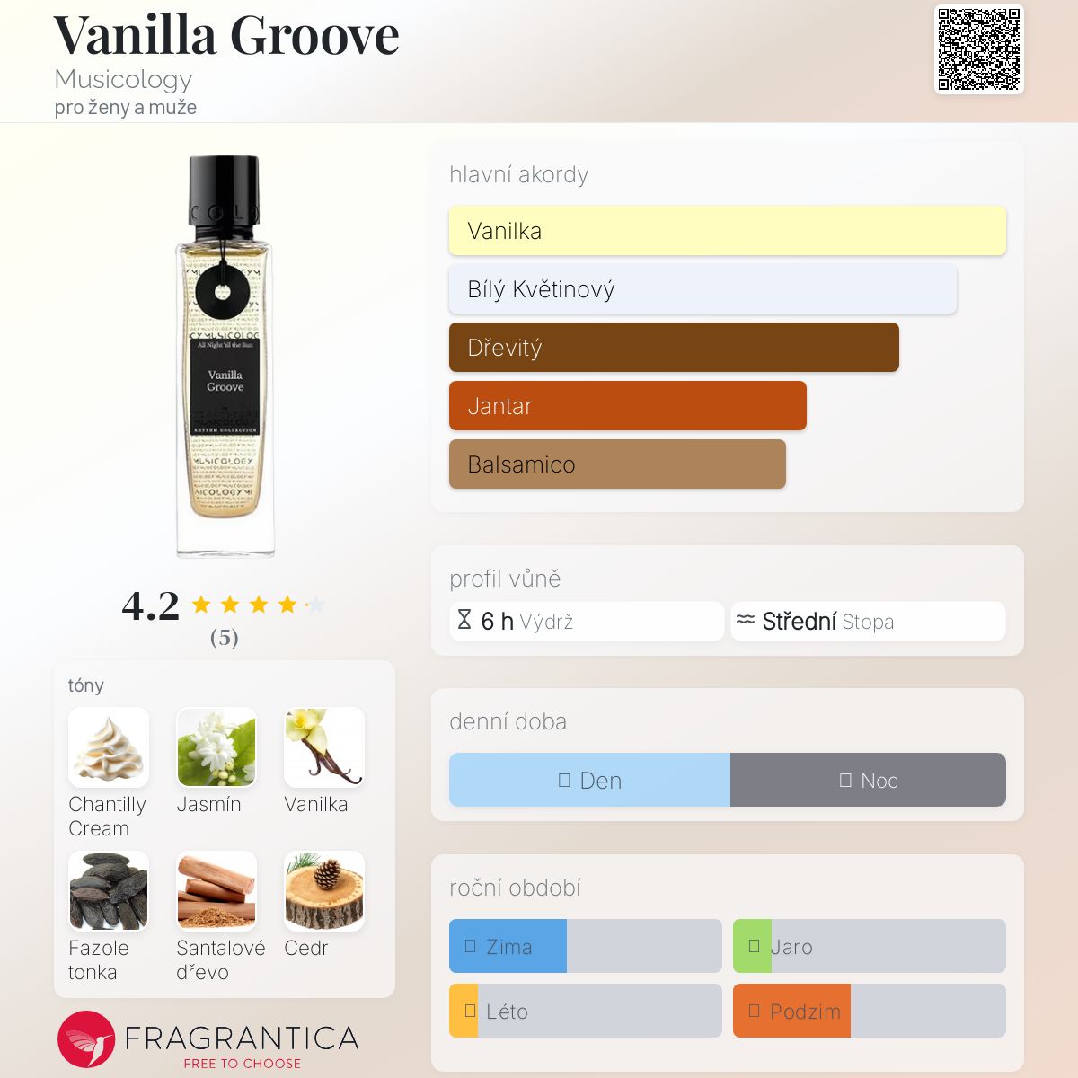 Vanilla Groove podle Musicology je Orientální Vanilla vůně pro ženy a muže. Toto je nová vůně. Vanilla Groove byl/a uveden/a v roce 2025. "Nosem" za touto vůní je Nathalie Lorson. Vrchní tóny jsou Šlehačka Chantilly, Jasmín a Sezam; střední tóny jsouVanilka, Fazole tonka a Otočník ; základní tóny jsou Santalové dřevo, Cedr a Pryskyřice.