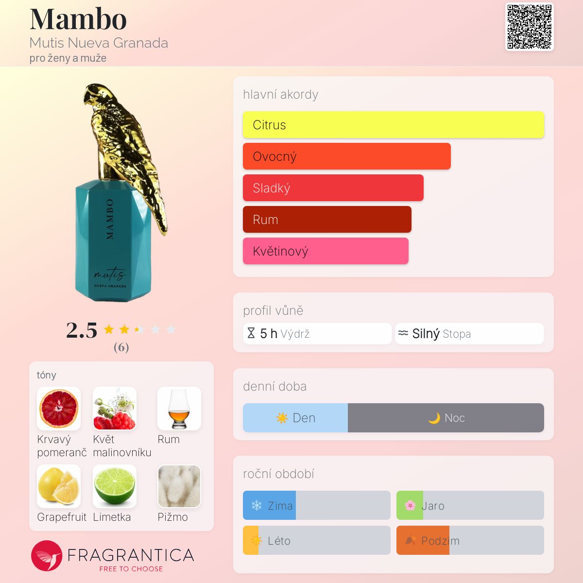 Mambo podle Mutis Nueva Granada je Citrus Gourmand vůně pro ženy a muže. Toto je nová vůně. Mambo byl/a uveden/a v roce 2025. "Nosem" za touto vůní je Luca Maffei. Vrchní tóny jsou Krvavý pomeranč, Grapefruit, Malinový květ a Limetka; střední tóny jsouRum, Mučenka a Mango ; základní tóny jsou Pižmo, Vanilka a Santalové dřevo.