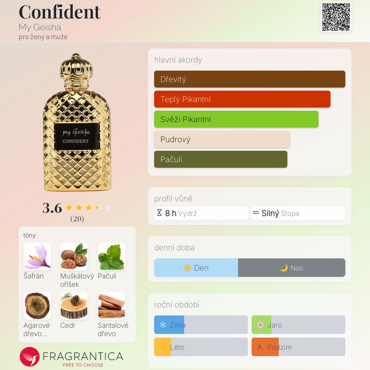 Confident podle My Geisha je Woody vůně pro ženy a muže. Confident byl/a uveden/a v roce 2021. Vrchní tóny jsou Šafrán, Muškátový oříšek, Tropické ovoce, Bergamot, Levandule a Magnólie; střední tóny jsouAgarové dřevo (oud), Jasmín, Pivoňka, Guava, Růže a Konvalinka ; základní tóny jsou Pačuli, Virginský cedr, Santalové dřevo, Pižmo a Kašmír.
