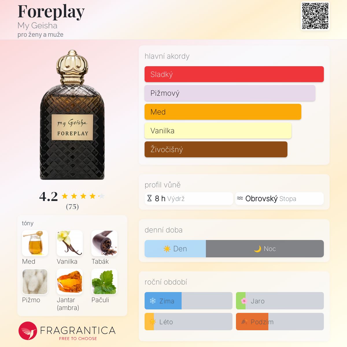 Foreplay podle My Geisha je Orientální vůně pro ženy a muže. Foreplay byl/a uveden/a v roce 2021. Vrchní tóny jsou Med a Růžový pepř; střední tóny jsouTabák a Pačuli ; základní tóny jsou Vanilka, Pižmo, Jantar (ambra) a Zvířecí tóny.
