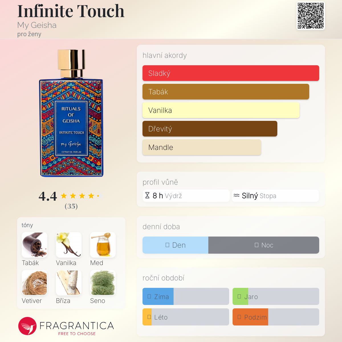 Infinite Touch podle My Geisha je Aromatic Spicy vůně pro ženy. Infinite Touch byl/a uveden/a v roce 2023. Vrchní tóny jsou Tabák, Med a Seno; střední tóny jsouVanilka, Vetiver, Pačuli a Kmín ; základní tóny jsou Bříza, Fazole tonka, Mandle a Bílý heliotrop.