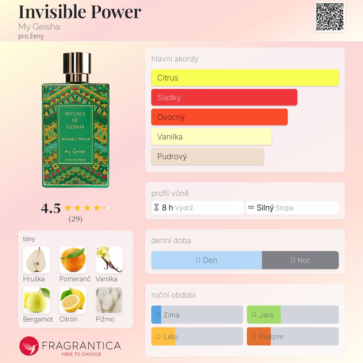 Invisible Power podle My Geisha je Orientální vůně pro ženy. Invisible Power byl/a uveden/a v roce 2023. Vrchní tóny jsou Pomeranč, Bergamot a Citrón; střední tóny jsouHruška, Třešeň a Borůvky ; základní tóny jsou Madagaskarská vanilka, Bílé pižmo a Jantar (ambra).