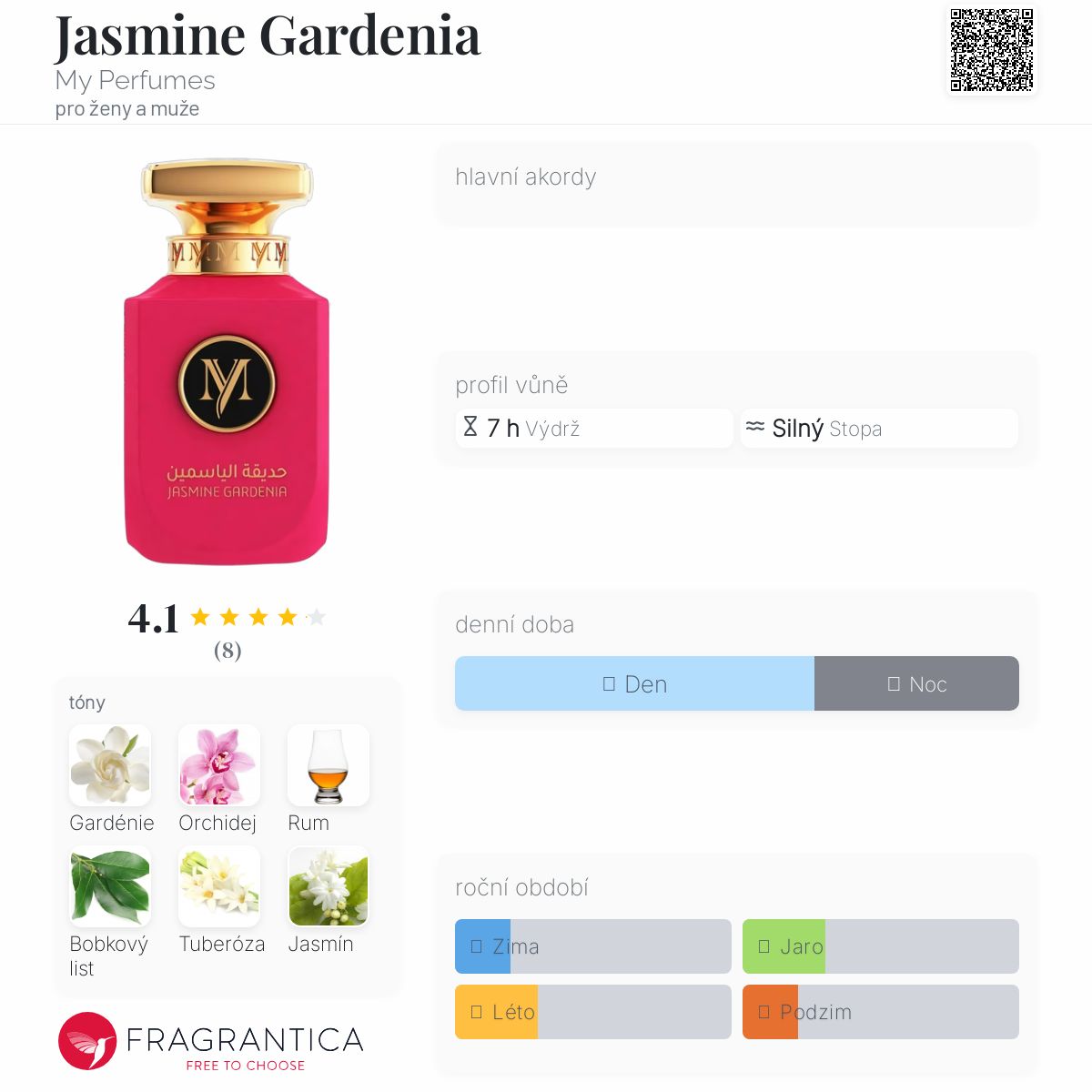 Jasmine Gardenia podle My Perfumes je Floral vůně pro ženy a muže. Jasmine Gardenia byl/a uveden/a v roce 2022. Vrchní tóny jsou Gardénie, Orchidej, Rum a Bobkový list; střední tóny jsouTuberóza, Jasmín a Meruňka ; základní tóny jsou Santalové dřevo a Vanilka.
