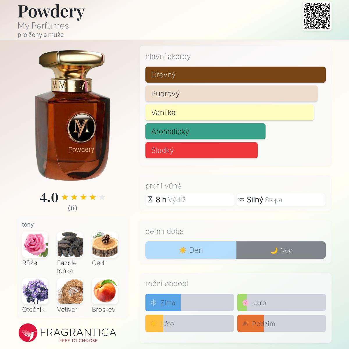 Powdery podle My Perfumes je Floral Woody Musk vůně pro ženy a muže. Vrchní tóny jsou Růže, Fazole tonka a Cedr; střední tóny jsouOtočník, Vetiver a Broskev ; základní tóny jsou Santalové dřevo, Vanilka a Pižmo.
