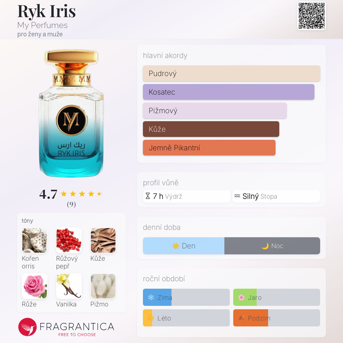 Ryk Iris podle My Perfumes je Orientální vůně pro ženy a muže. Ryk Iris byl/a uveden/a v roce 2022. Vrchní tóny jsou Růžový pepř, Šafrán a Jantar (ambra); střední tóny jsouOrris, Kůže a Růže ; základní tóny jsou Vanilka, Pižmo a Jantar (ambra).