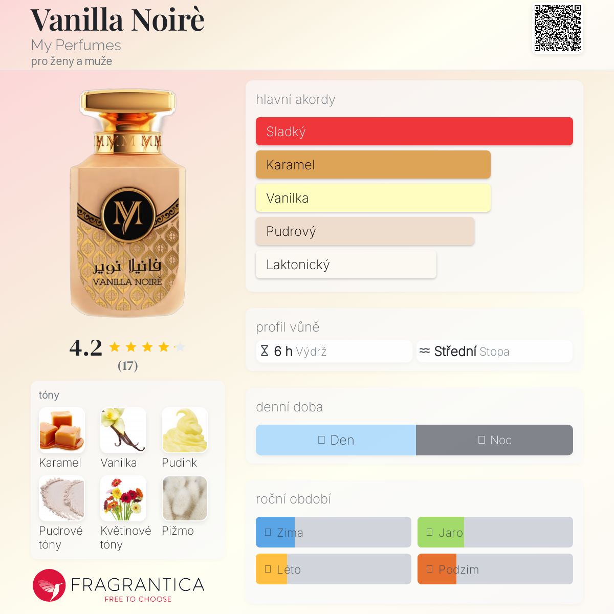 Vanilla Noirè podle My Perfumes je Orientální Vanilla vůně pro ženy a muže. Vanilla Noirè byl/a uveden/a v roce 2023. Vrchní tóny jsou Karamel, Pudrové tóny a Květinové tóny; střední tóny jsouVanilka, Vanilka, Pudink a Pižmo ; základní tóny jsou Vanilkový lusk, Sladké tóny a Jantar (ambra).