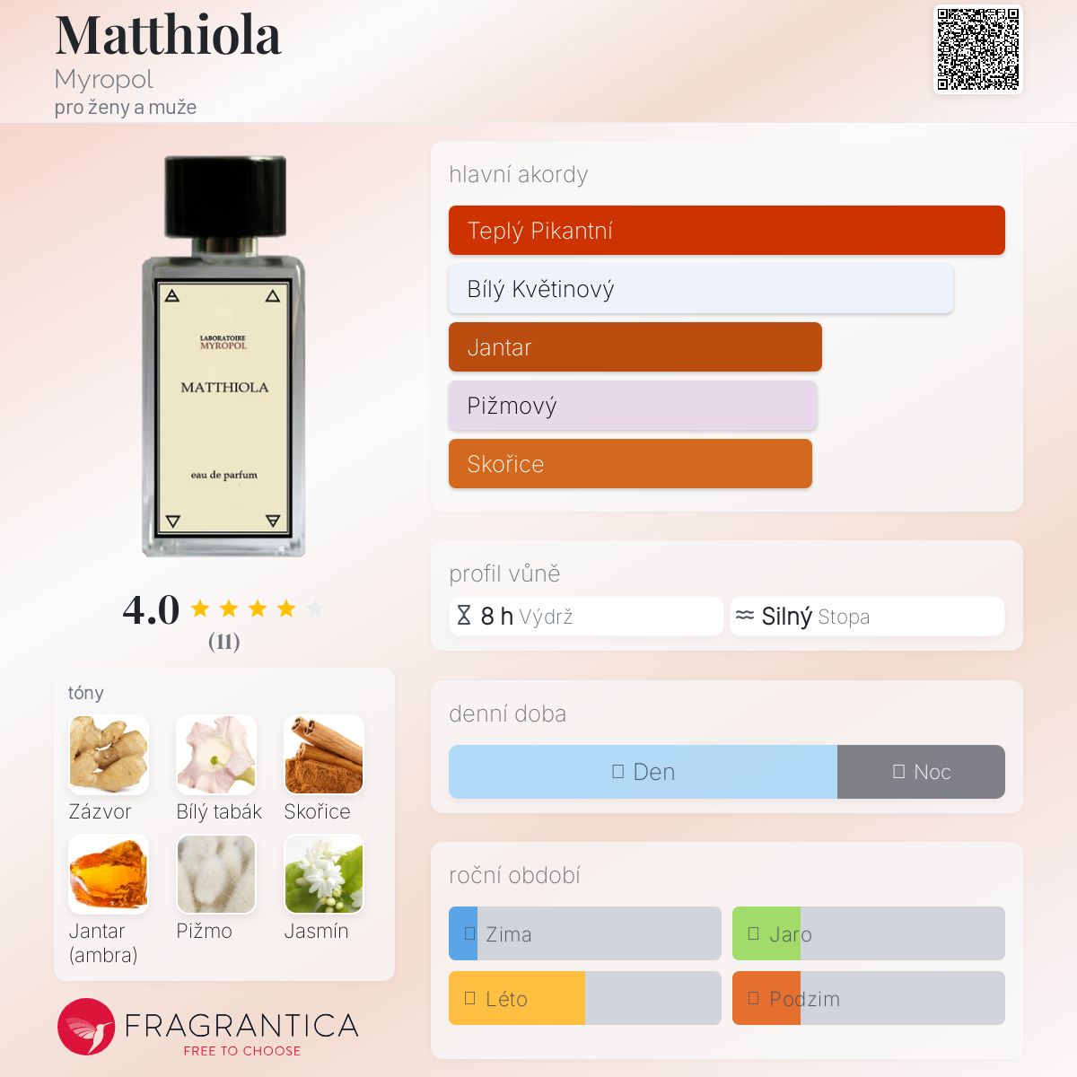 Matthiola podle Myropol je Floral vůně pro ženy a muže. Matthiola byl/a uveden/a v roce 2010. "Nosem" za touto vůní je Andrey Oleynikov. Vrchní tóny jsou Zázvor, Bílý tabák, Pižmo a Indole; střední tóny jsouSkořice, Jasmín, Hřebíček, Šalvěj a Zelené tóny ; základní tóny jsou Jantar (ambra) a Cibetka.