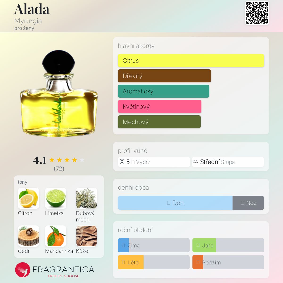 Alada podle Myrurgia je Floral Woody Musk vůně pro ženy. Alada byl/a uveden/a v roce 1979. "Nosem" za touto vůní je Ramon Monegal. Vrchní tóny jsou Citrón, Limetka, Mandarinka, Šalvěj a Broskev; střední tóny jsouKarafiát, Jasmín, Kořeněné tóny a Brambořík ; základní tóny jsou Dubový mech, Cedr, Kůže a Pižmo.