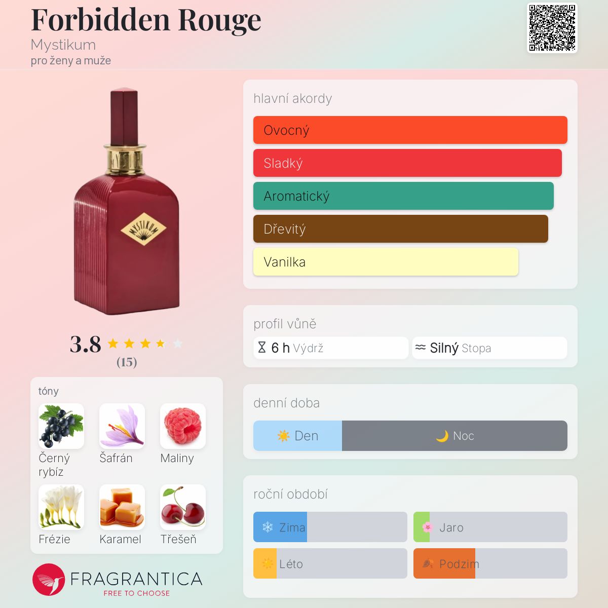 Forbidden Rouge podle Mystikum je vůně pro ženy a muže. Toto je nová vůně. Forbidden Rouge byl/a uveden/a v roce 2025. "Nosem" za touto vůní je Ralf Schwieger. Vrchní tóny jsou Černý rybíz, Šafrán, Badyán, Bergamot, Zázvor a Šalvěj muškátová; střední tóny jsouMaliny, Frézie, Karamel, Třešeň, Levandule a Rozmarýn ; základní tóny jsou Fazole tonka, Vanilka, Pačuli, Cedr a Vetiver.