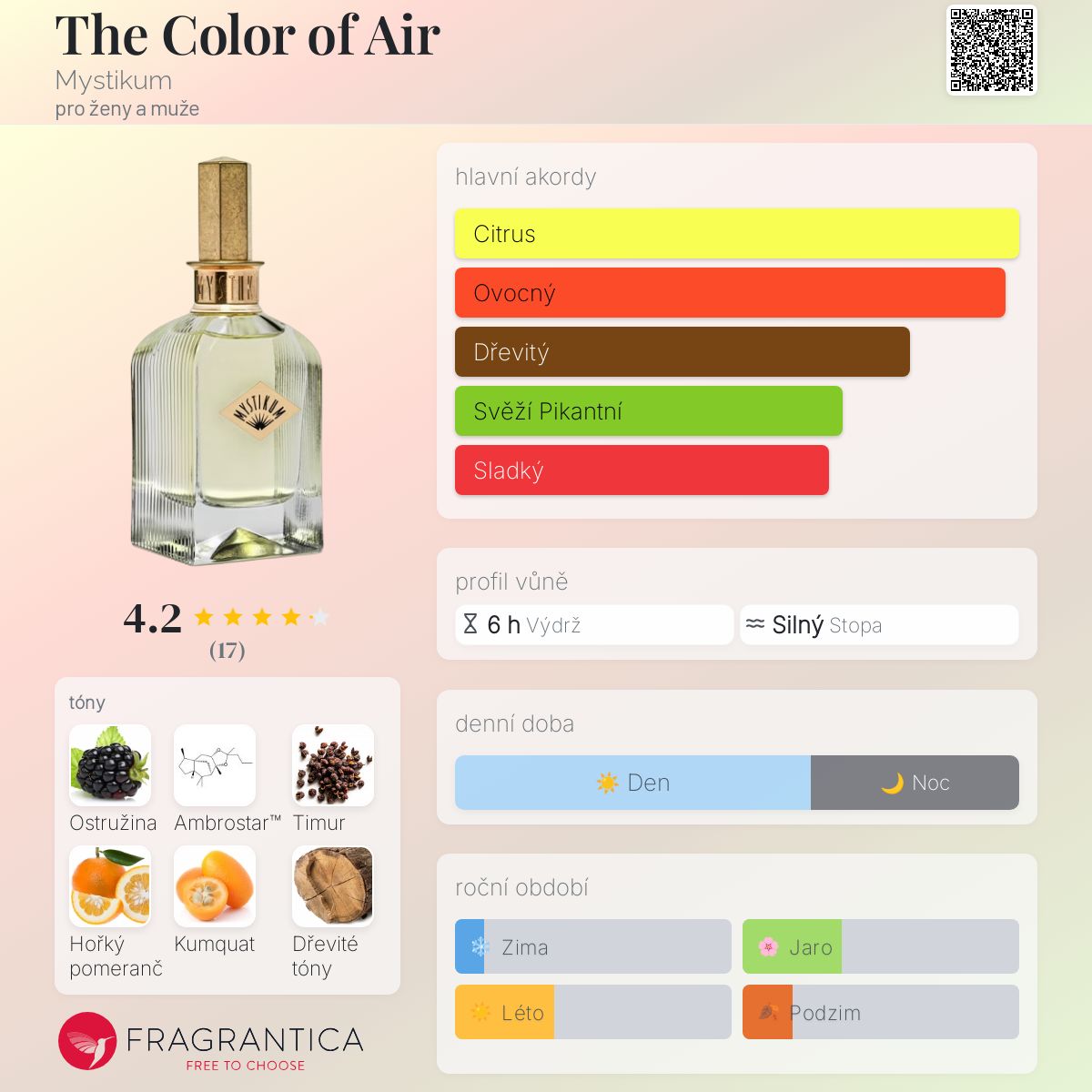 The Color of Air podle Mystikum je Woody Aromatic vůně pro ženy a muže. Toto je nová vůně. The Color of Air byl/a uveden/a v roce 2025. "Nosem" za touto vůní je Alexandre Illan. Vrchní tóny jsou Hořký pomeranč, Kumquat a Koriandr; střední tóny jsouOstružina, Timur a Dřevité tóny ; základní tóny jsou Ambrostar™, Pačuli a Jantar (ambra).