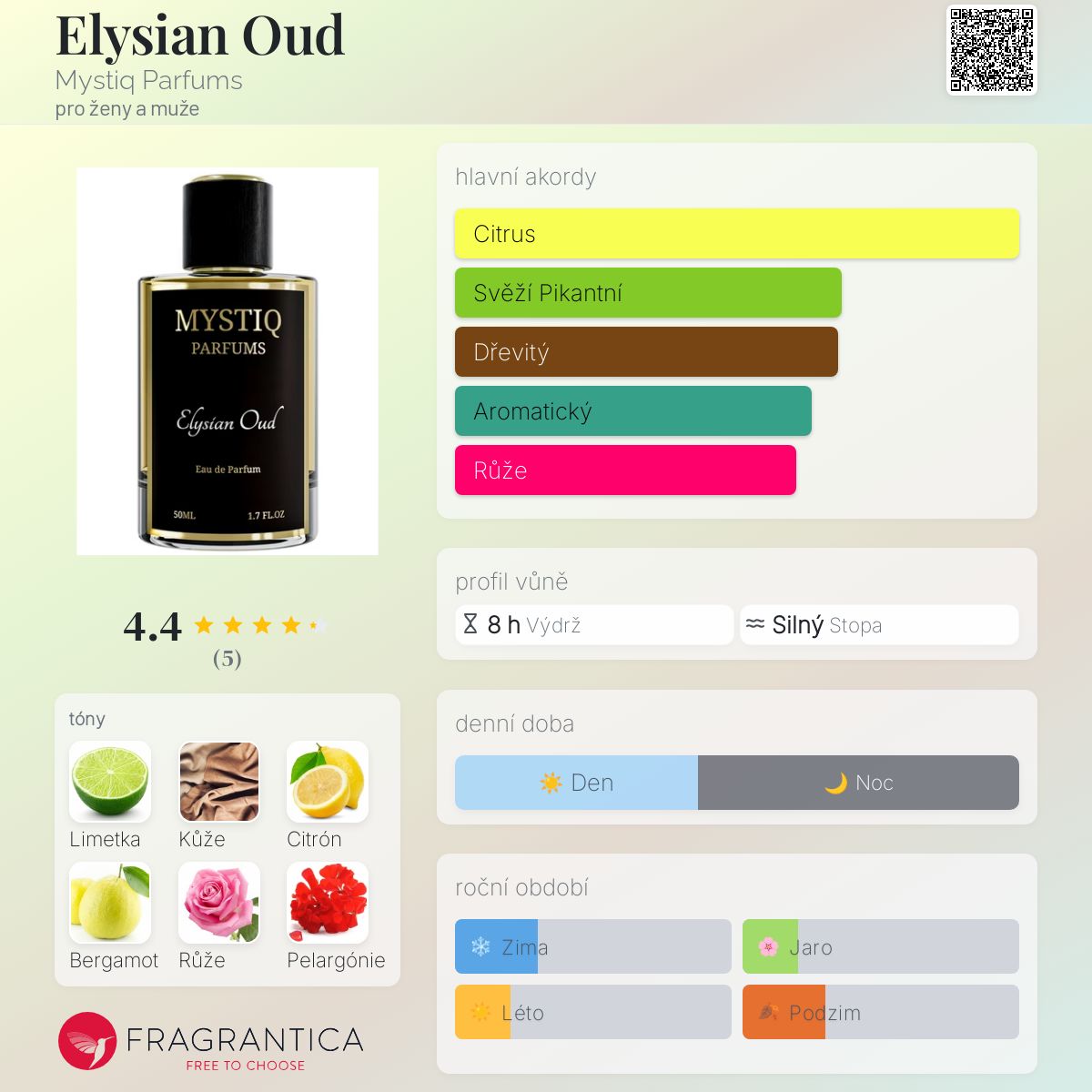 Elysian Oud podle Mystiq Parfums je vůně pro ženy a muže. Toto je nová vůně. Elysian Oud byl/a uveden/a v roce 2025. Vrchní tóny jsou Limetka, Citrón, Bergamot a Sladký pomeranč; střední tóny jsouRůže, Pelargónie, Kosatec a Karamel ; základní tóny jsou Kůže, Agarové dřevo (oud), Jantar (ambra), Dubový mech, Santalové dřevo a Cedr.