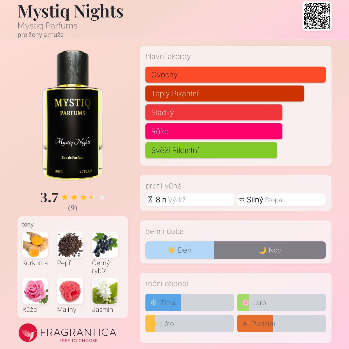 Mystiq Nights podle Mystiq Parfums je Floral vůně pro ženy a muže. Toto je nová vůně. Mystiq Nights byl/a uveden/a v roce 2024. Vrchní tóny jsou Černý rybíz, Kurkuma a Pepř; střední tóny jsouTurecká růže, Maliny a Jasmín ; základní tóny jsou Dubový mech, Fazole tonka a Pižmo.
