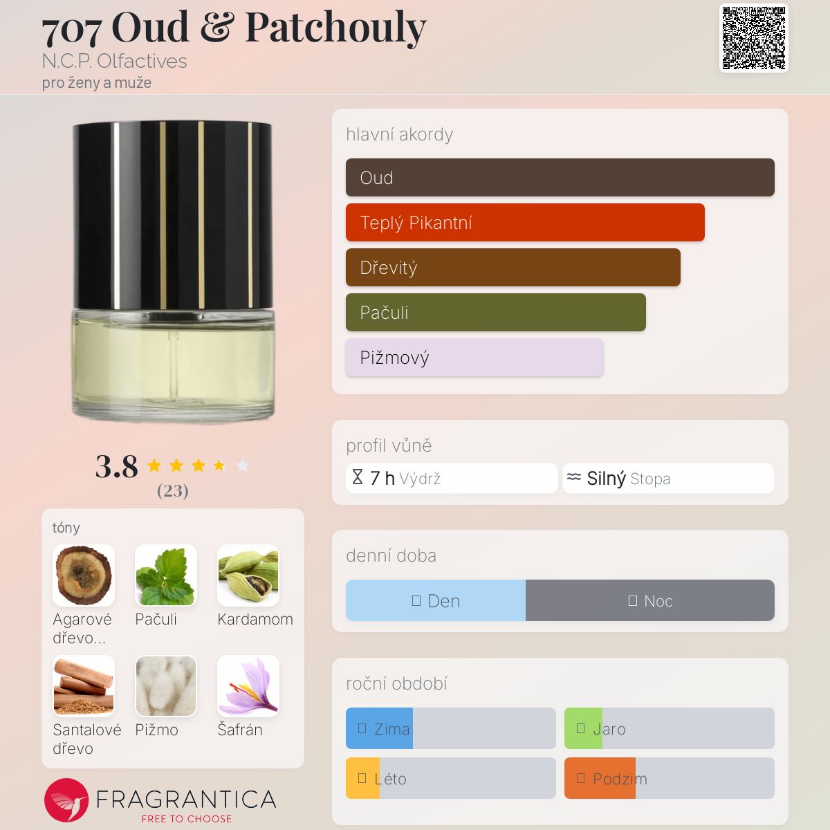 707 Oud & Patchouly podle N.C.P. Olfactives je Woody Spicy vůně pro ženy a muže. Vrchní tóny jsou Agarové dřevo (oud), Kardamom a Šafrán; střední tóny jsouPačuli a Santalové dřevo ; základní tóny jsou Agarové dřevo (oud), Pižmo a Jantar (ambra).