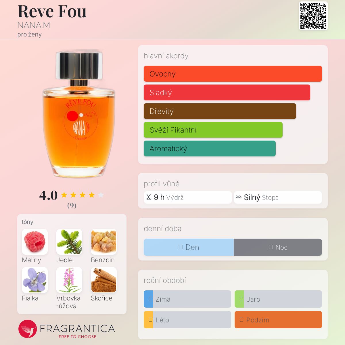 Reve Fou podle NANA.M je Orientální Vanilla vůně pro ženy. Reve Fou byl/a uveden/a v roce 2015. "Nosem" za touto vůní je Céline Ripert. Vrchní tóny jsou Jedle balzámová, Vrbovka růžová, Pelyněk a Hořký pomeranč; střední tóny jsouMaliny, Fialka, Skořice a Růže de Mai ; základní tóny jsou Siamský (thajský) benzoin, Vanilka a Pačuli.