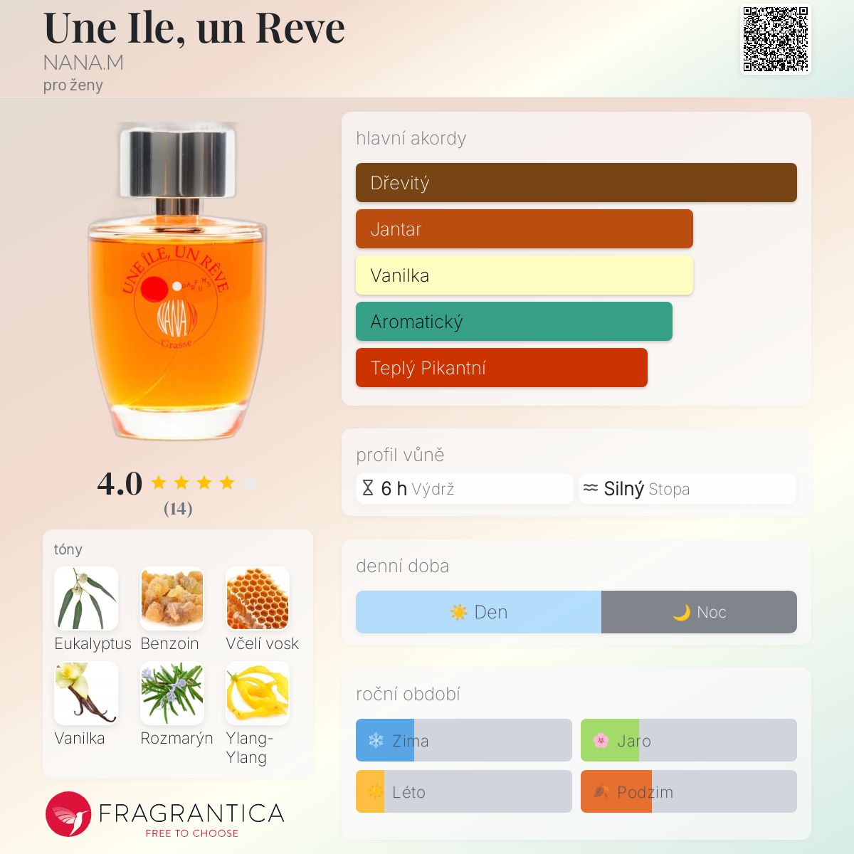 Une Ile, un Reve podle NANA.M je Floral vůně pro ženy. Une Ile, un Reve byl/a uveden/a v roce 2015. "Nosem" za touto vůní je Céline Ripert. Vrchní tóny jsou Eukalyptus, Rozmarýn a Skalní růže; střední tóny jsouYlang-Ylang, Tuberóza, Marocký jasmín a Pomeranč ; základní tóny jsou Siamský (thajský) benzoin, Včelí vosk, Vanilka a Pačuli.